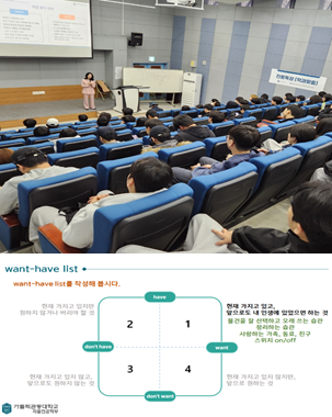 1학기에 진행하는 미래설계세미나1에서는 맞춤형 진로 특강, MBTI 심층검사 기반 자기 이해, 2학기에 진행하는 미래설계세미나2에서는 "제2의 입학"을 주제로 한 다전공 이해 수업을 통해 학생들이 충분한 탐색과 준비를 거쳐 자신에게 가장 적합한 전공을 선택할 수 있도록 지원합니다.