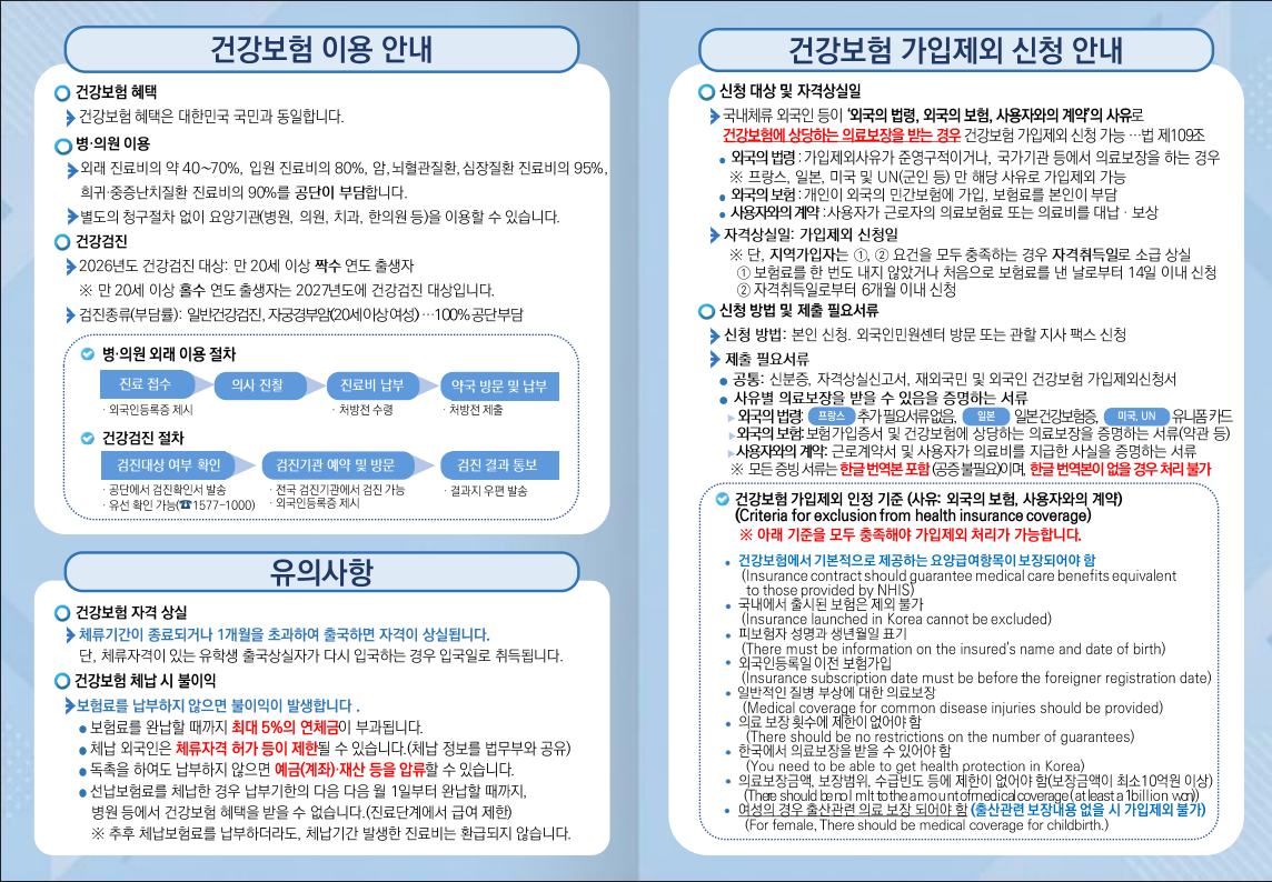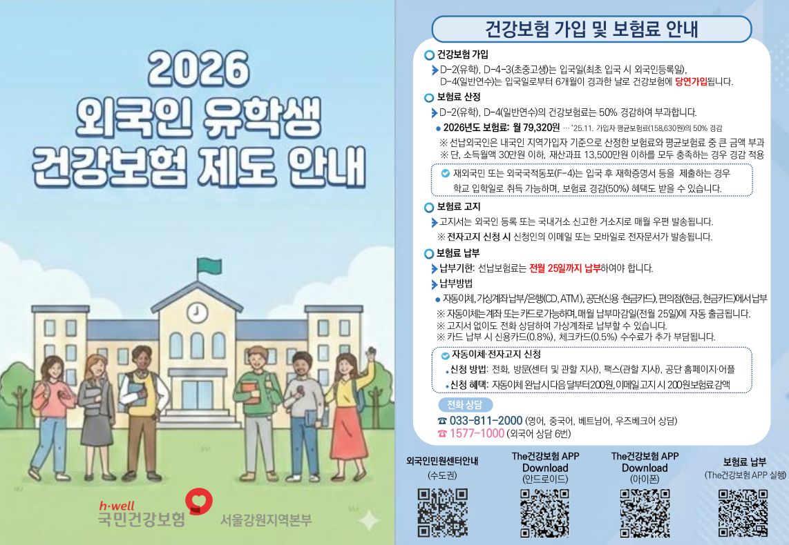 fnctId=bbs,fnctNo=1138 글번호 363262 2026 외국인 유학생 건강보험 제도 안내(수정) 수정일 2026.03.09 작성자 국제교류처 조회수 80 등록일 2026.02.26 첨부파일 1-1. 지역가입자 계좌 자동이체_환급계좌 신청서.hwp 바로보기 1-2. 지역가입자 신용카드 자동이체 신청서.hwp 바로보기 2. 전자고지_서비스_신규·변경·해지(철회)_신청서.hwp 바로보기 (붙임1) 외국인 유학생 건강보험 제도 안내.pdf 바로보기