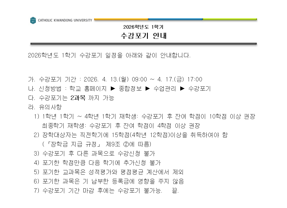 fnctId=bbs,fnctNo=369 글번호 364144 2026-1학기 수강포기 안내 수정일 2026.04.06 작성자 최은주 조회수 185 등록일 2026.04.06 첨부파일 첨부파일이(가) 없습니다.