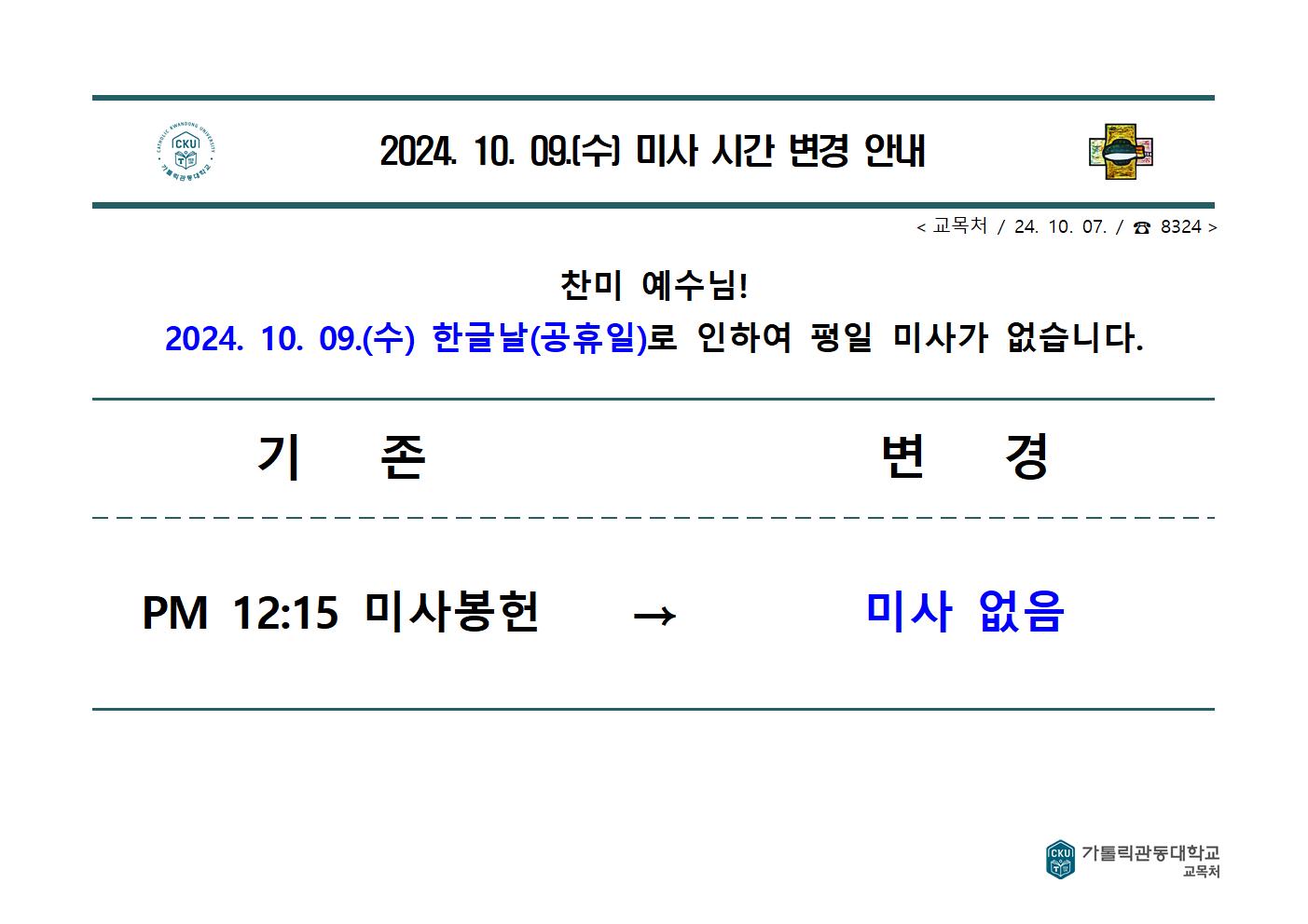 2024. 10. 09.(수) 미사 시간 변경 안내