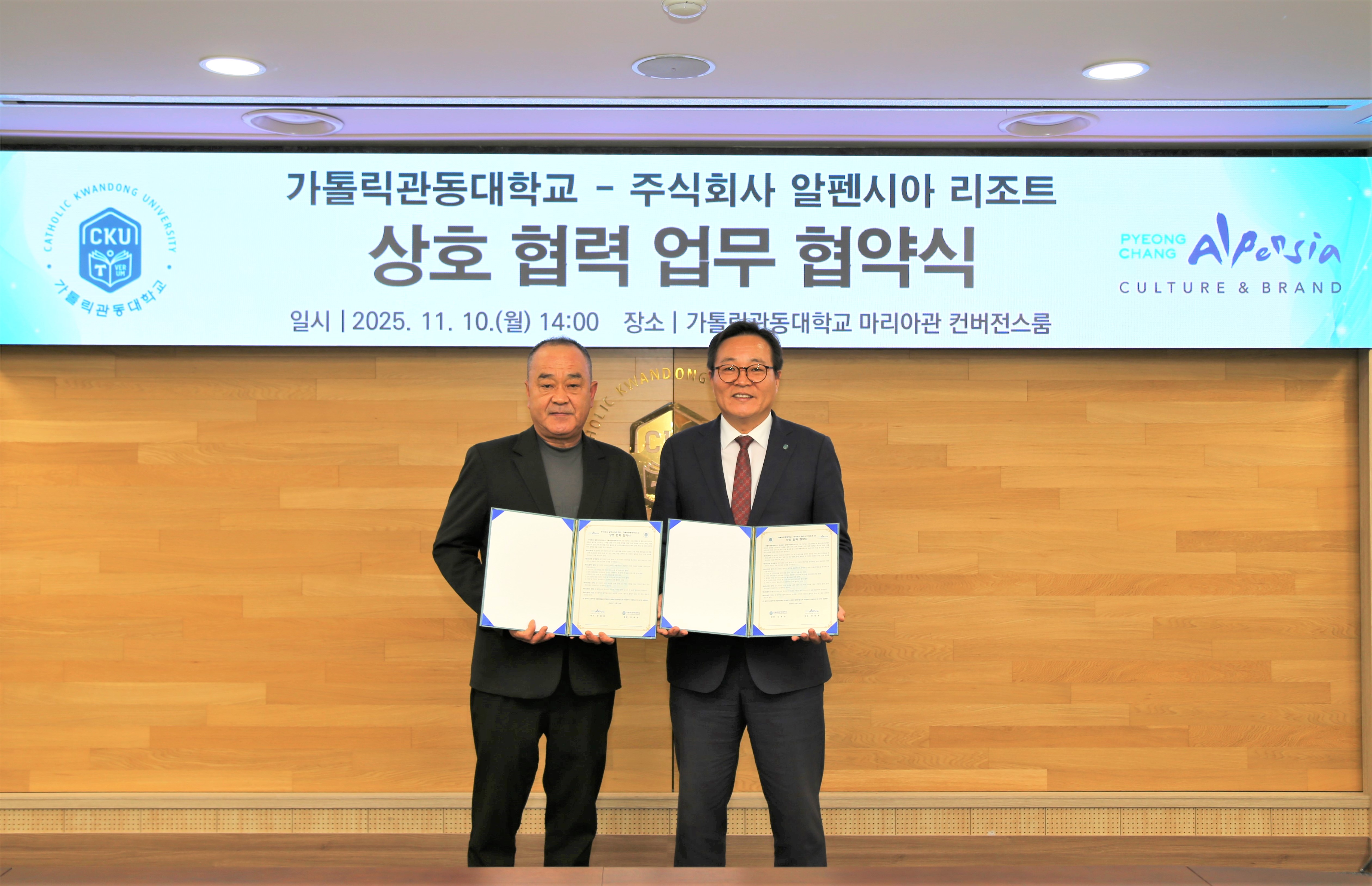 우리 대학이 11월 10일(오늘) 알펜시아리조트(대표 장철원)와 스포츠재활 및 융합스포츠산업의 성장과 발전을 위해 상호 협력하는 업무협약(MOU)을 체결했다. 이번 협약은 가톨릭관동대학교 김호석 대외협력본부장의 주관으로 진행됐다.