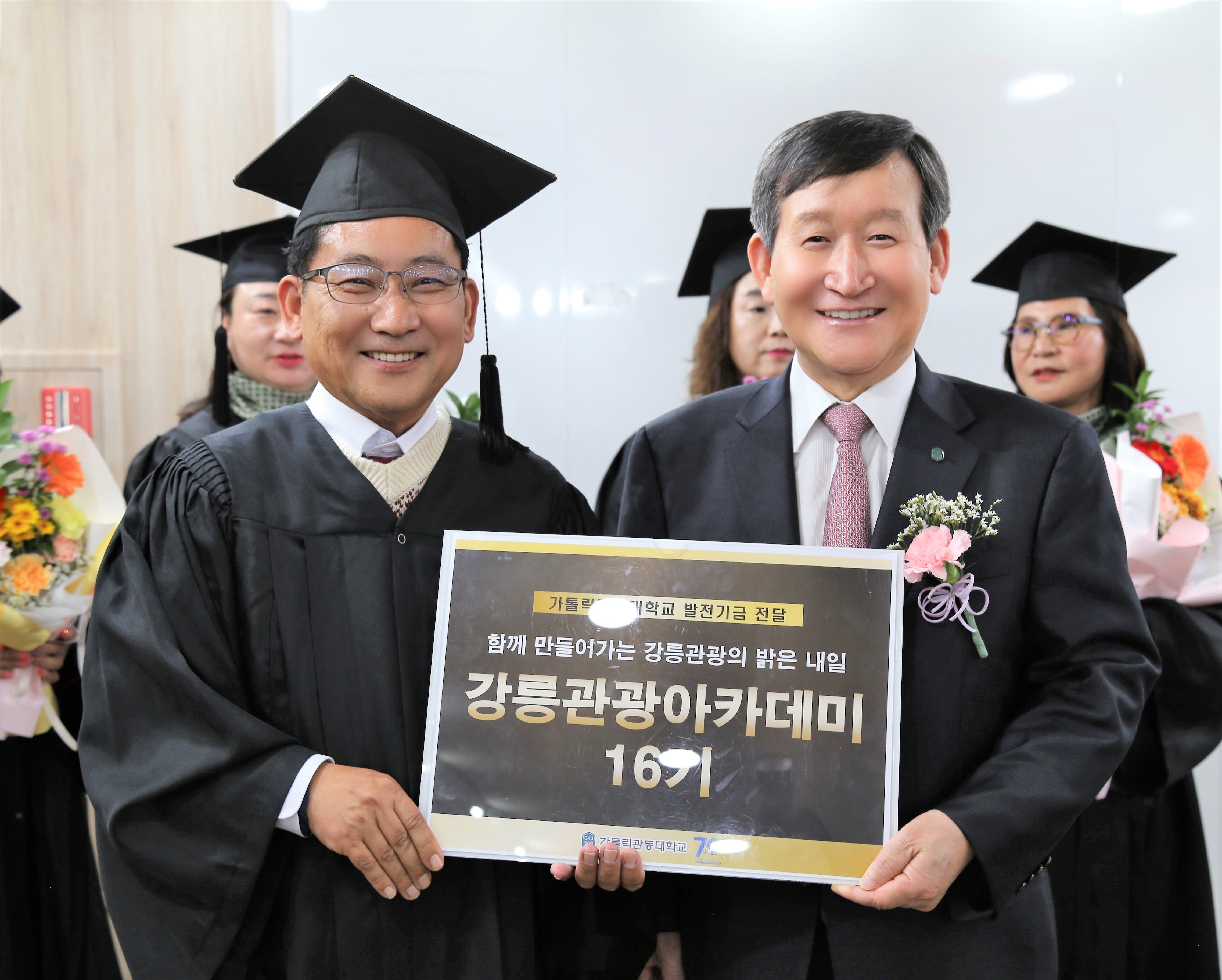 이날 수료식에서는 모범상에 최희정, 개근상에 표기준, 공로상에 김복남·김정숙·김정옥(김미서)·박규례·전숙희·전인수·조경임 씨가 각각 수상했다. 또한 강릉관광아카데미 총원우회 서동진 회장과 공로상 수상자 일동이 대학 발전기금을 전달하며 지역과 대학의 상생 의지를 함께 다졌다.