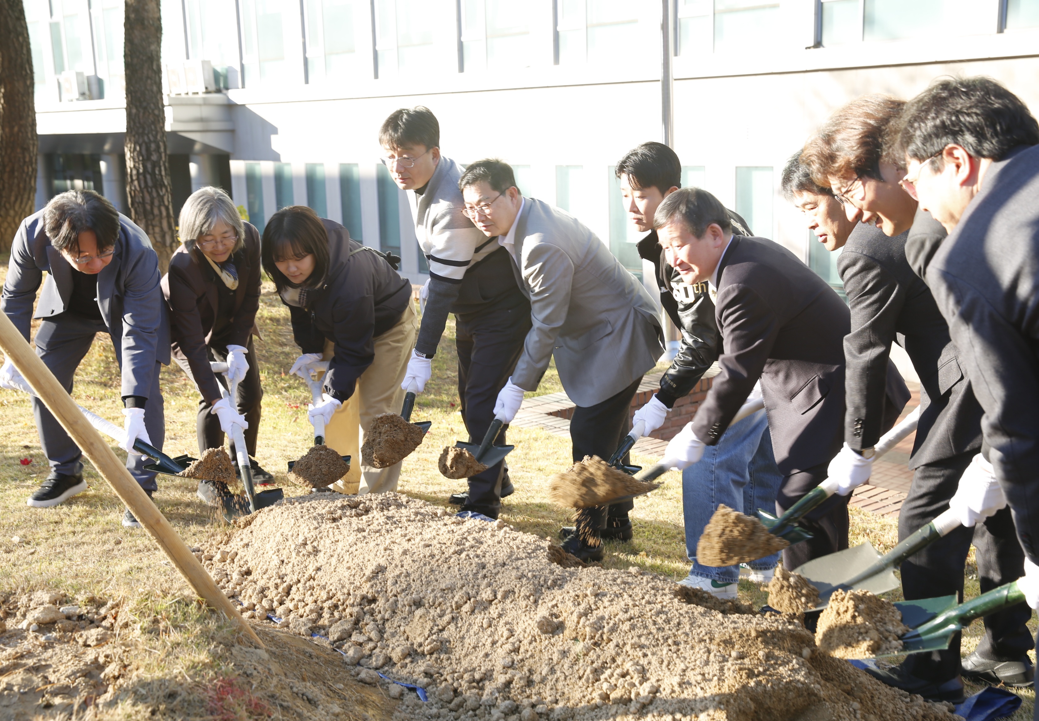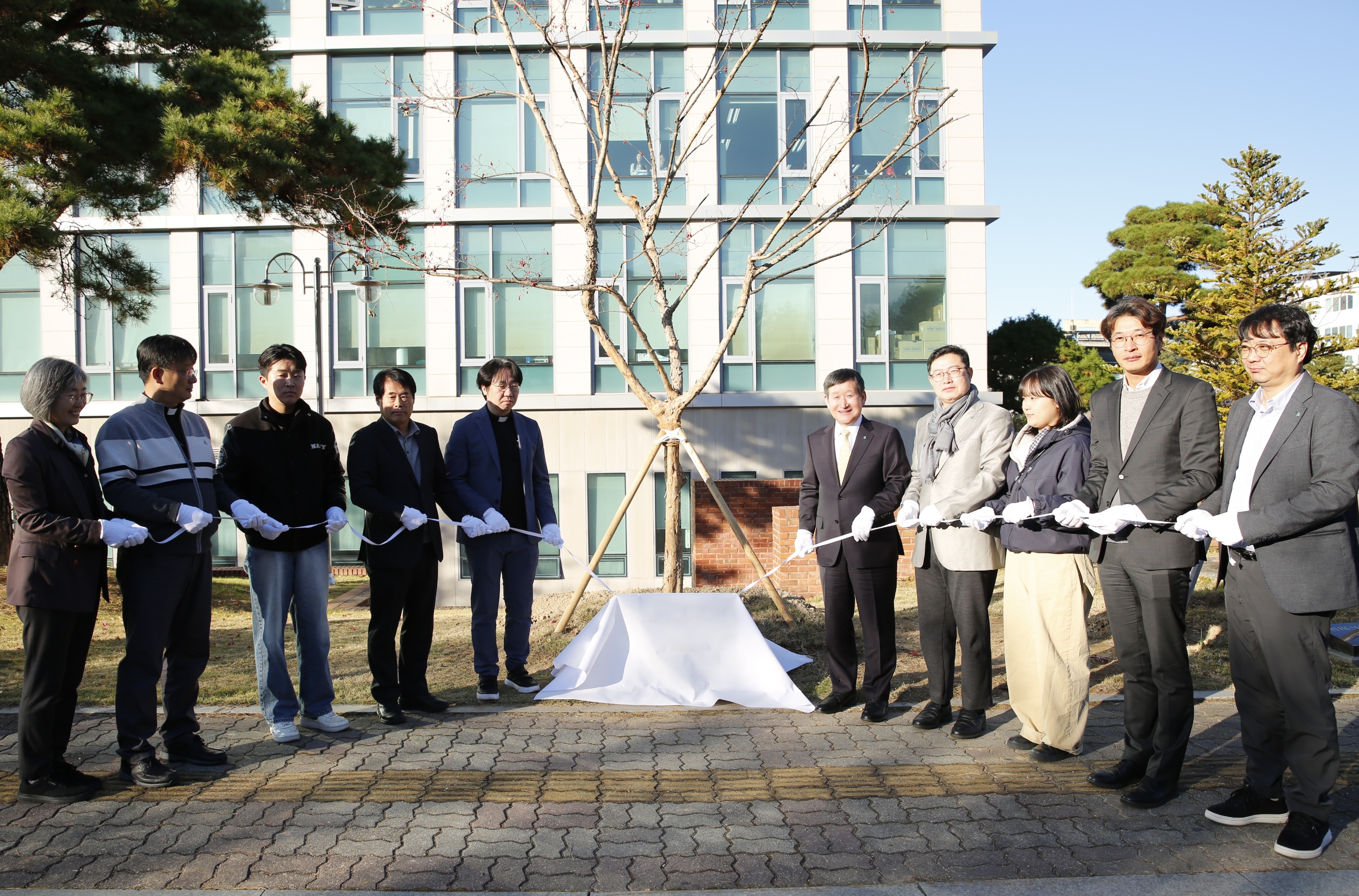 이날 행사에는 김용승 총장을 비롯해 대학 주요 보직자와 김진훈 총학생회장, 박연우 부총학생회장 등이 함께 자리했으며, 교정 내 조성된 식수 기념비 앞에서 제막 및 시삽 행사가 진행됐다.