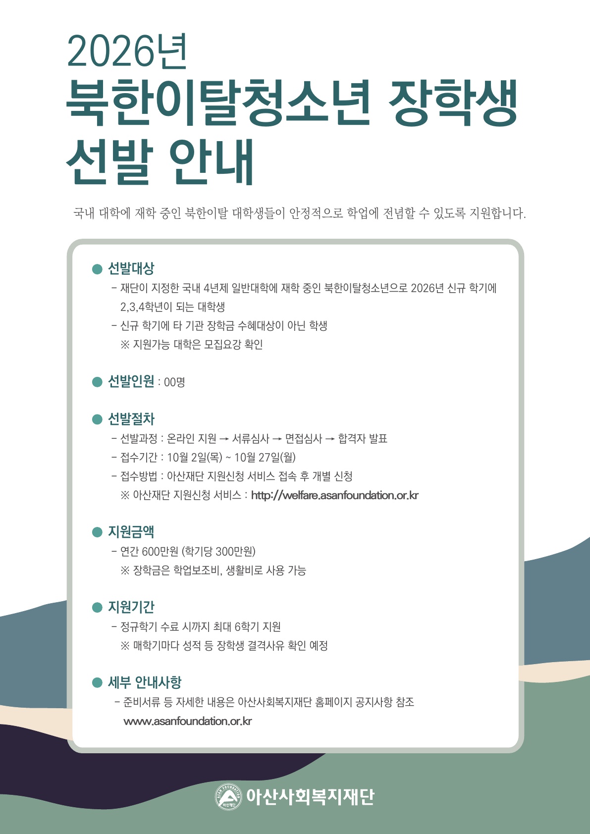 [아산사회복지재단] 2026년 북한이탈청소년장학생 선발 안내