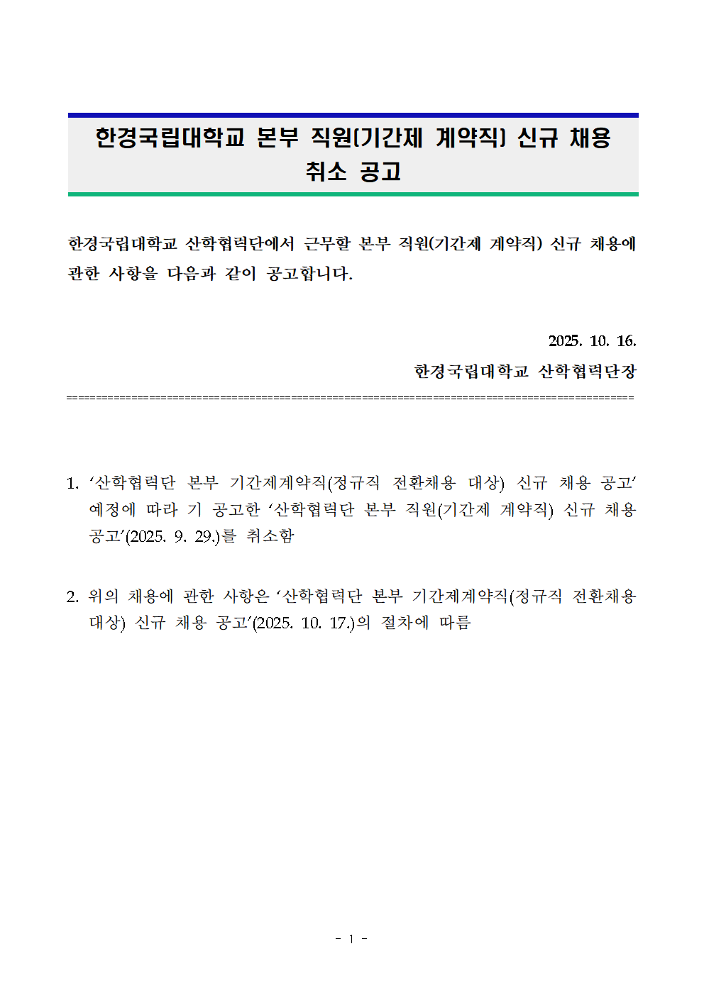 한경국립대학교 산학협력단 기간제계약직(정규직 전환채용 대상) 신규 채용 안내