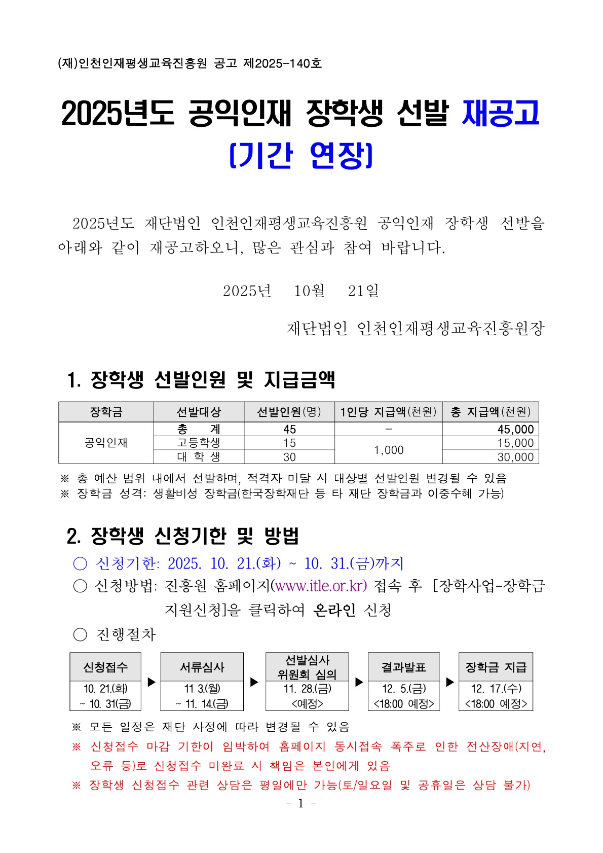 [(재)인천인재평생교육진흥원] 2025년도 공익인재 장학생 선발 재공고(기간 연장) 안내