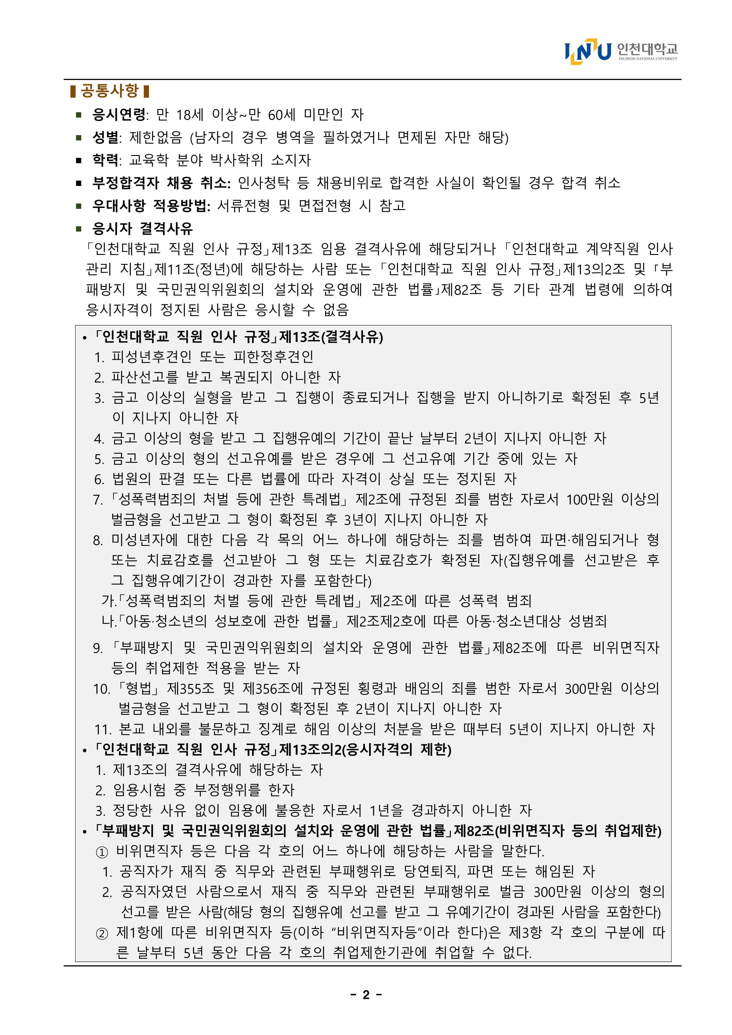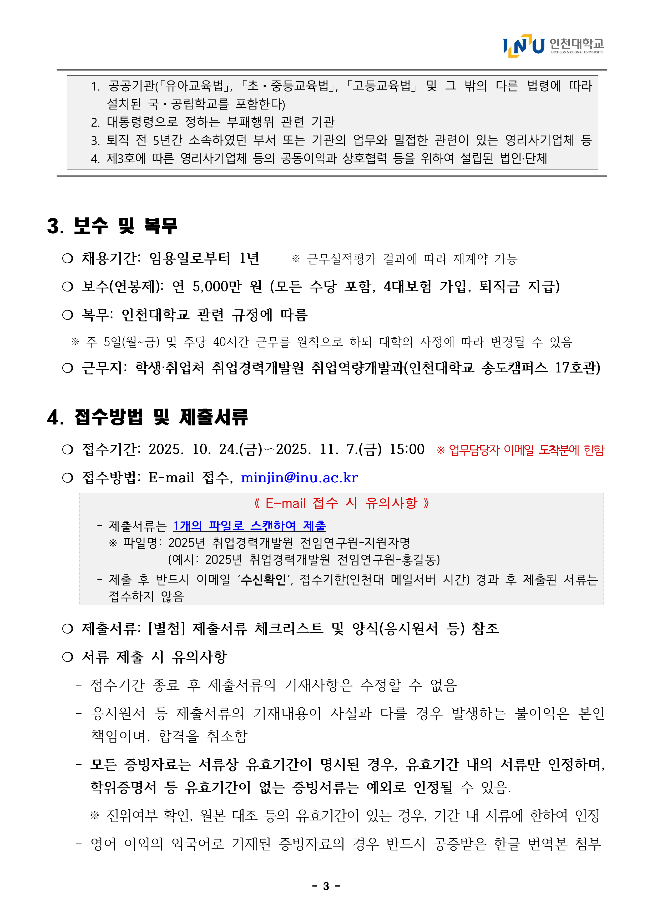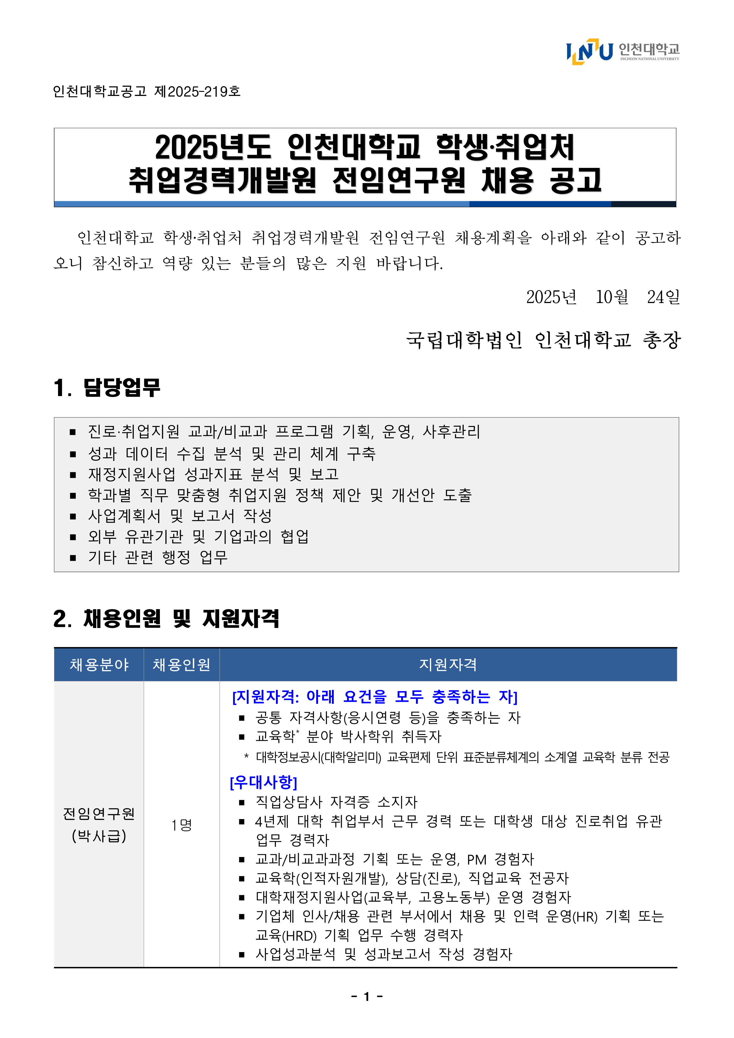 2025년도 인천대학교 학생취업처 취업경력개발원 전임연구원 채용 공고