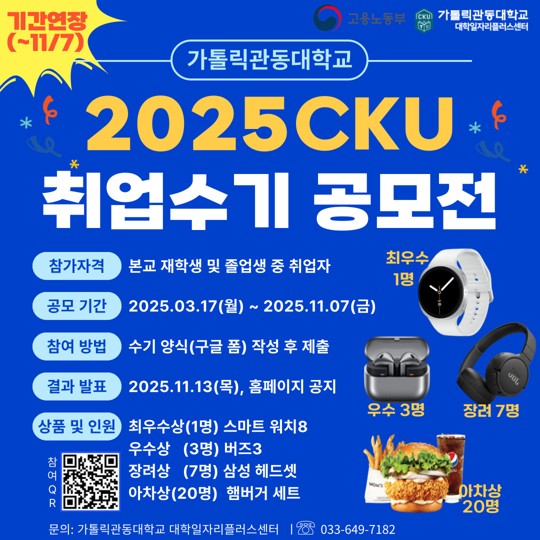 가톨릭관동대학교 대학일자리+센터는 취업성공 사례를 수집하여 재학생 진로지도 및 취업준비에 도움을 드리고자 '2025 CKU 취업수기 공모전'을 다음과 같이 실시하고자 합니다.