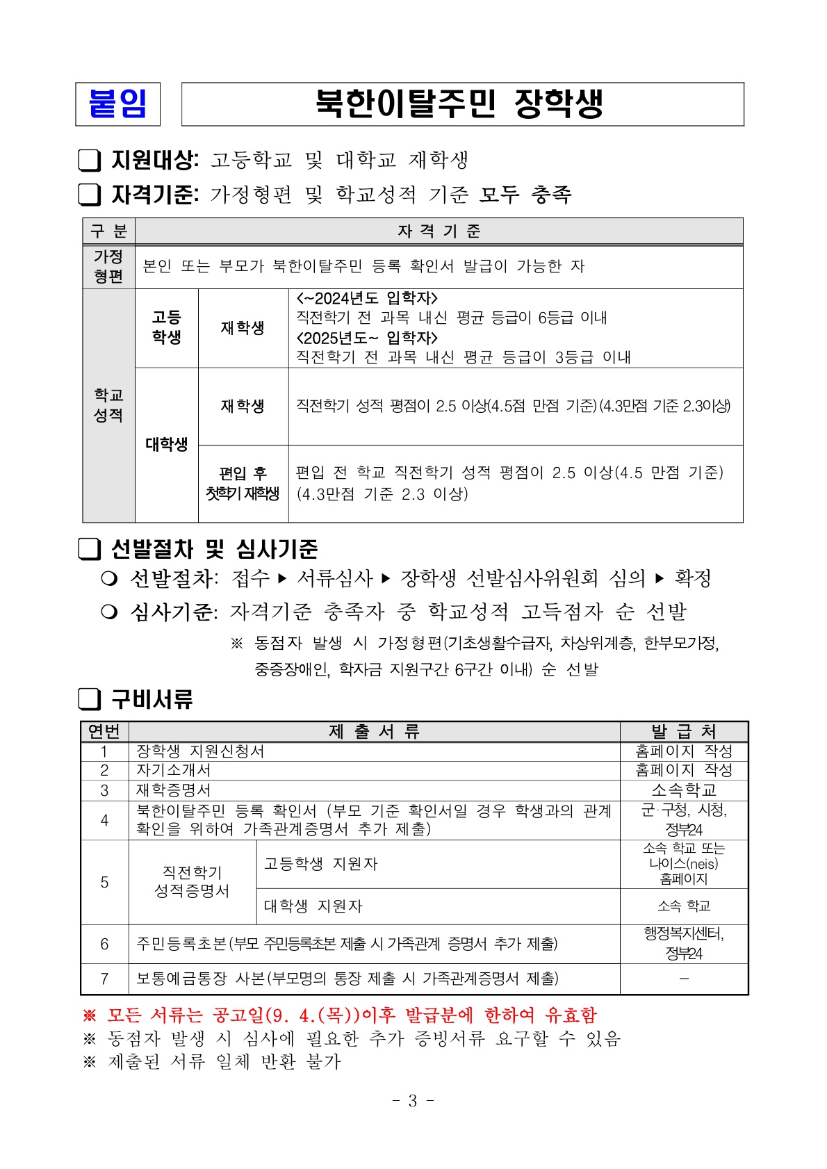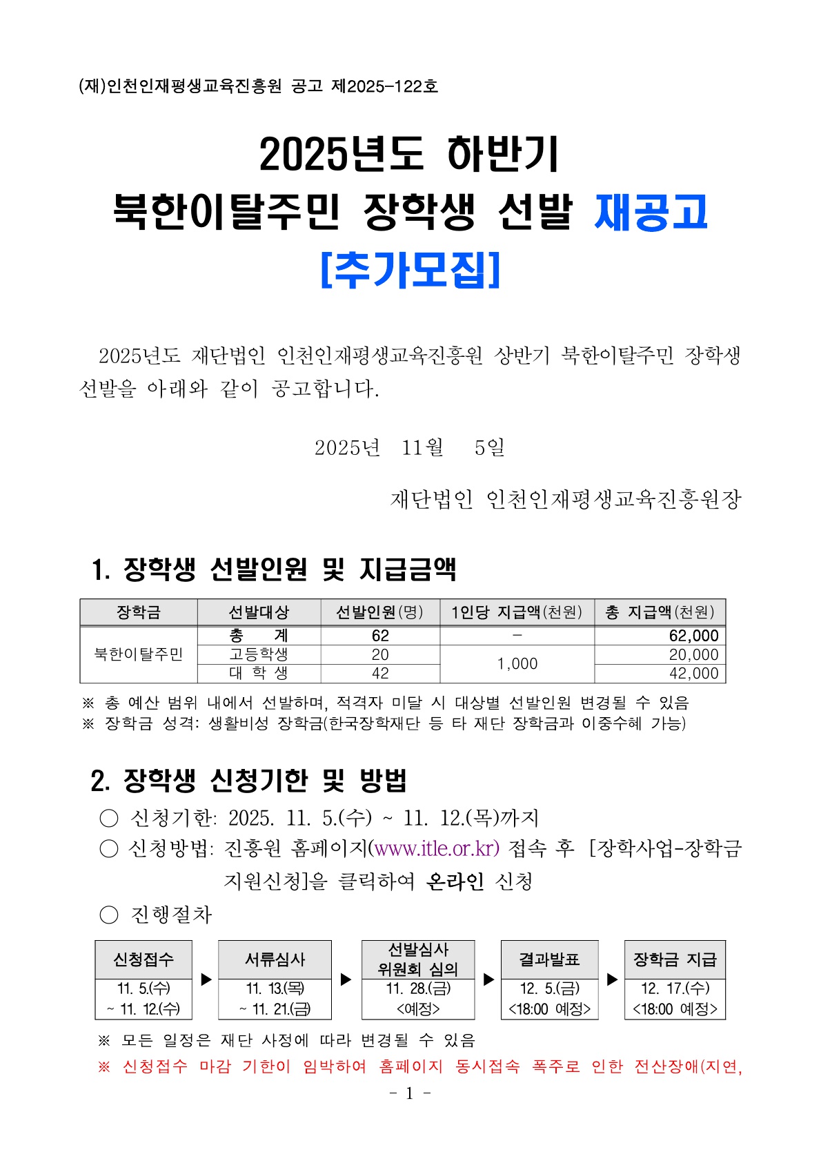 [(재)인천인재평생교육진흥원] 2025년도 하반기 「북한이탈주민 지원 장학생 선발」 추가모