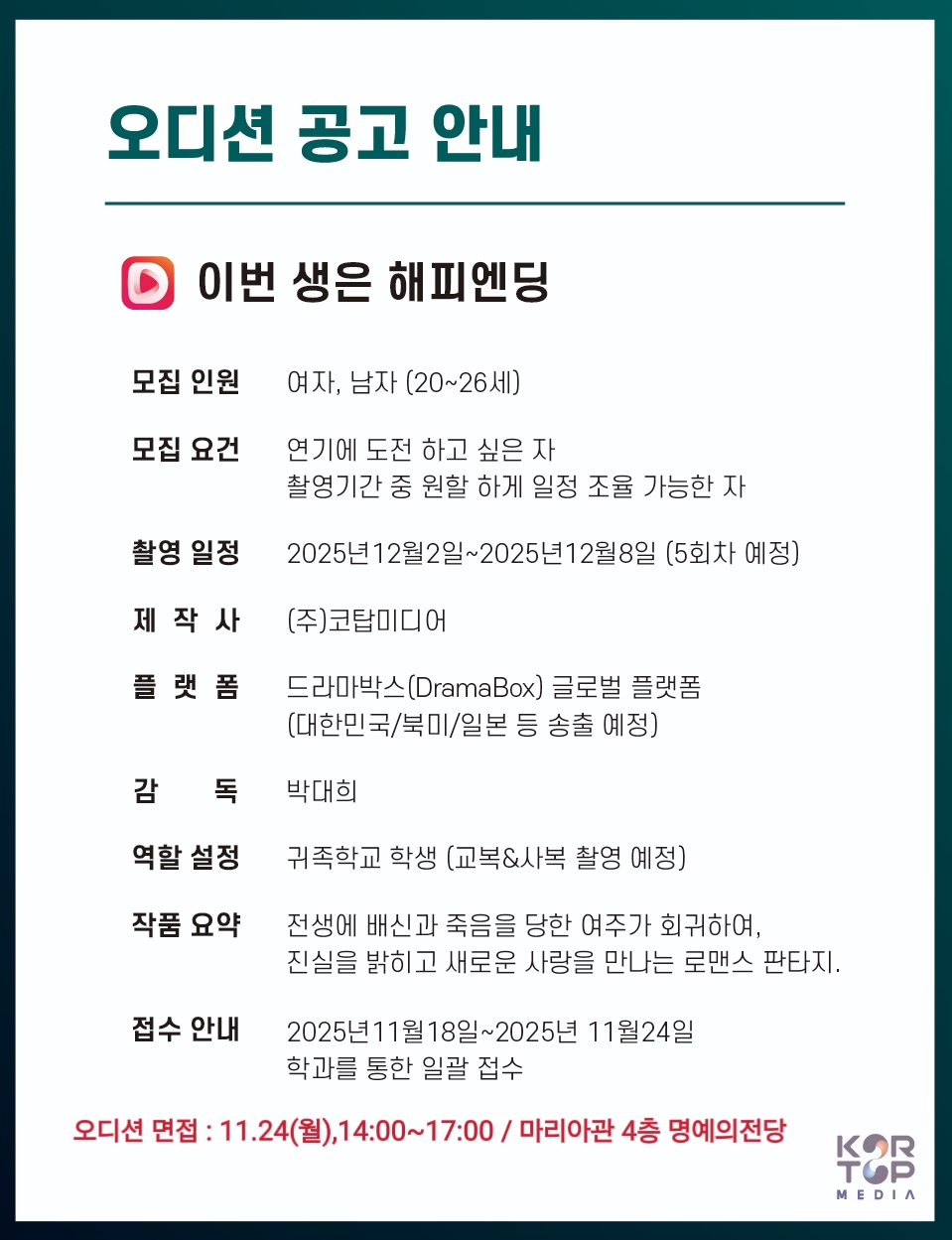 가톨릭관동대 재학생을 대상으로 영화배급사에서 오디션이 에정되어 있습니다.