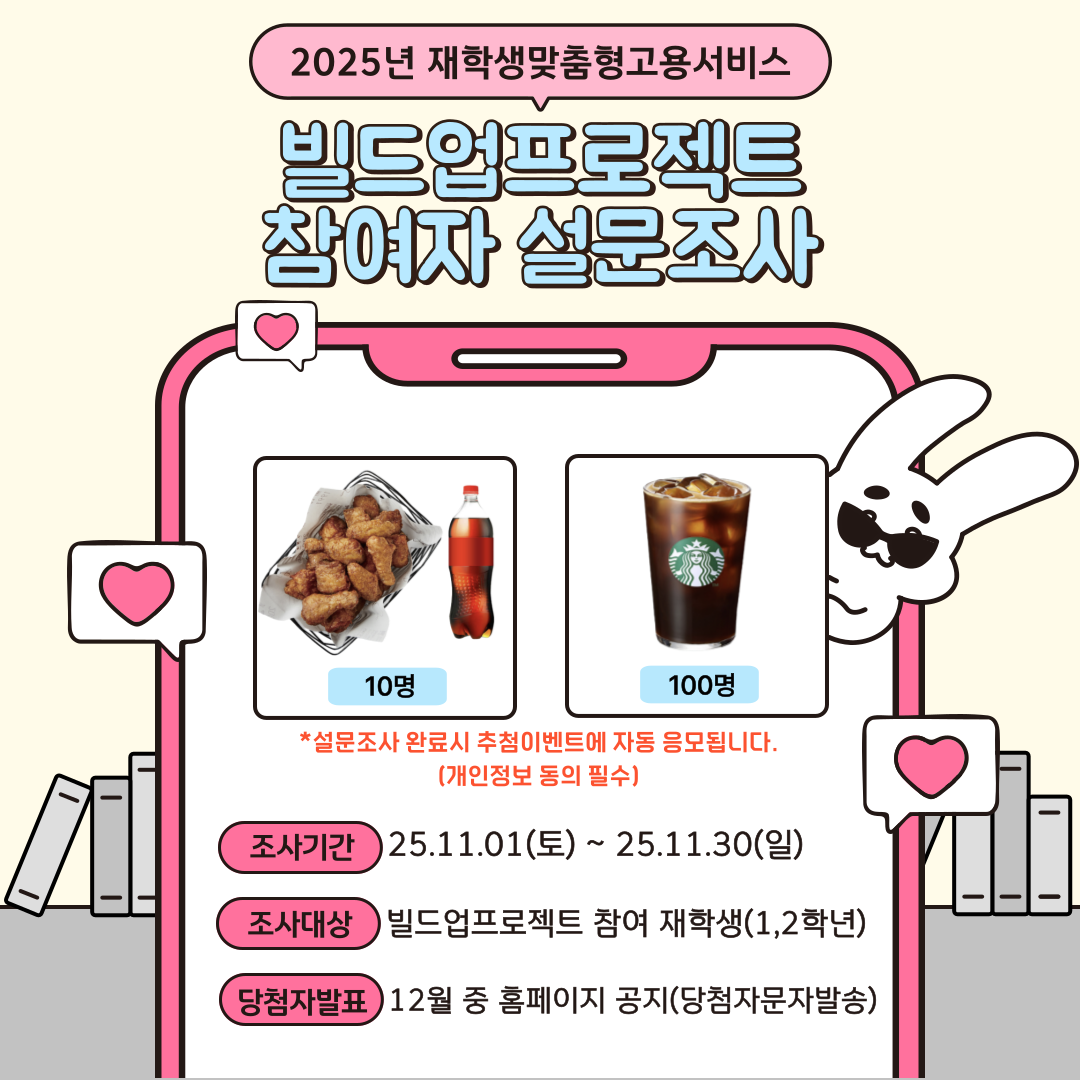 대학일자리+센터 재학생맞춤형고용서비스팀에서는 2025 빌드업·점프업프로젝트 참여 학생을 대상으로 설문조사를 실시합니다.
