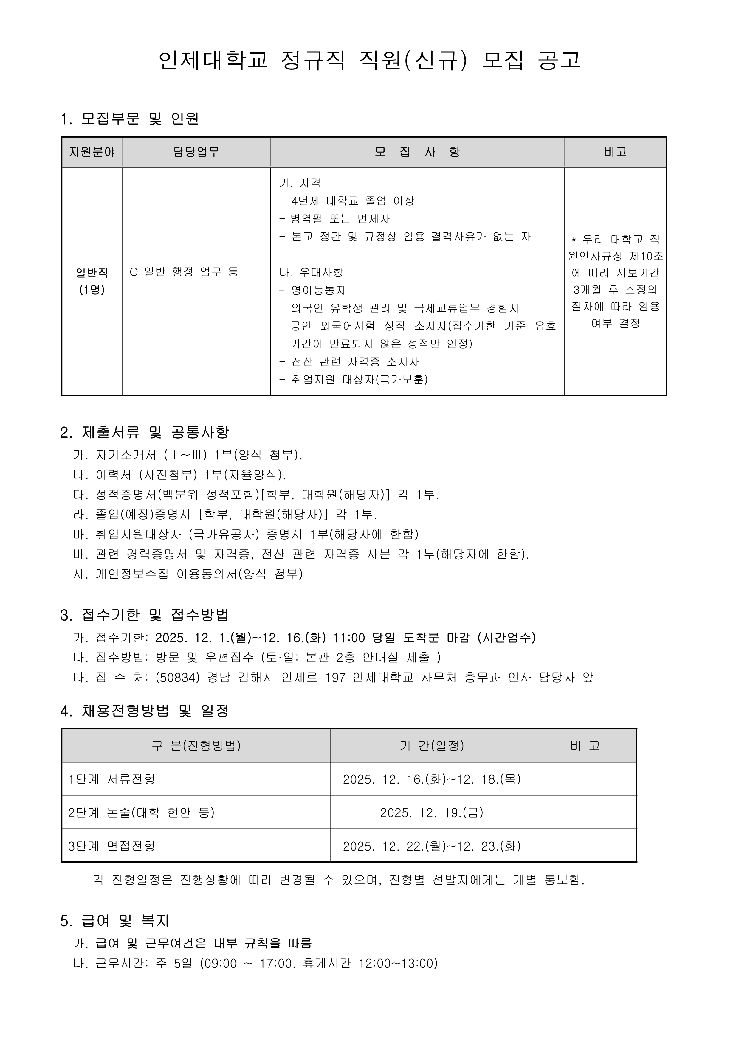 인제대학교 정규직 직원 신규채용 공고