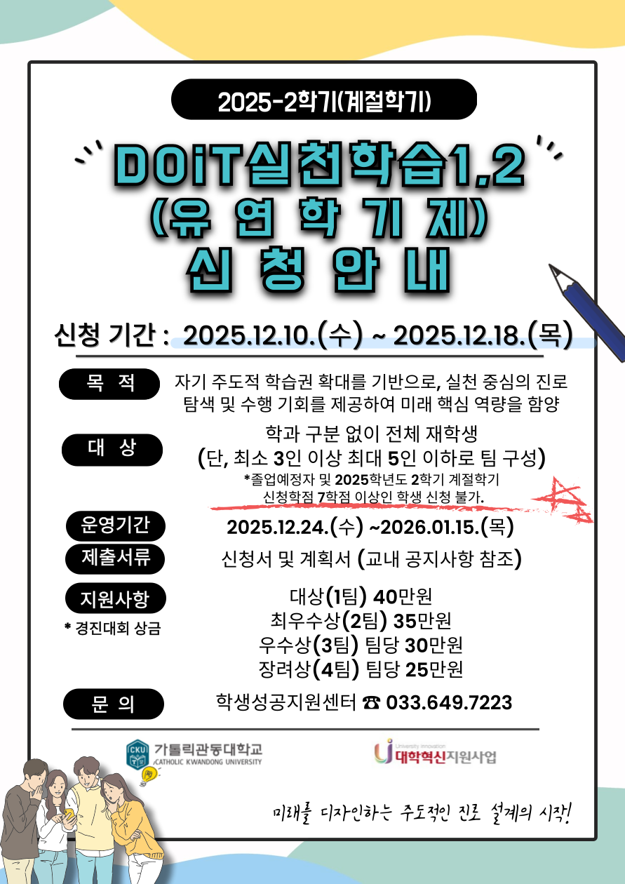 가톨릭관동대학교 학생성공지원센터는 2025학년도 2학기 계절학기에 운영하는 ‘DOiT실천학습1,2(유연학기제)’ 에 대하여 다음과 같이 공모하오니 , 주도적인 진로설계를 만들어가고자 하는 학생들의 많은 관심과 참여를 바랍니다.