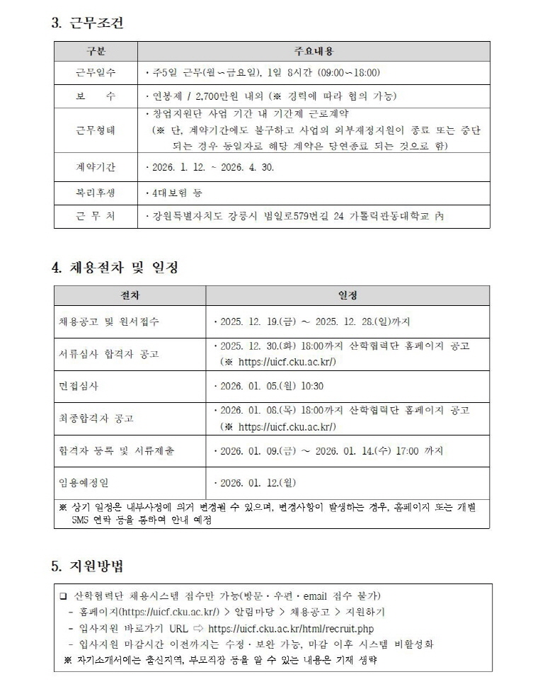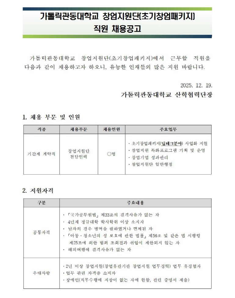 가톨릭관동대학교 창업지원단(초기창업패키지) 직원 채용공고(2026.1.12 임용예정)