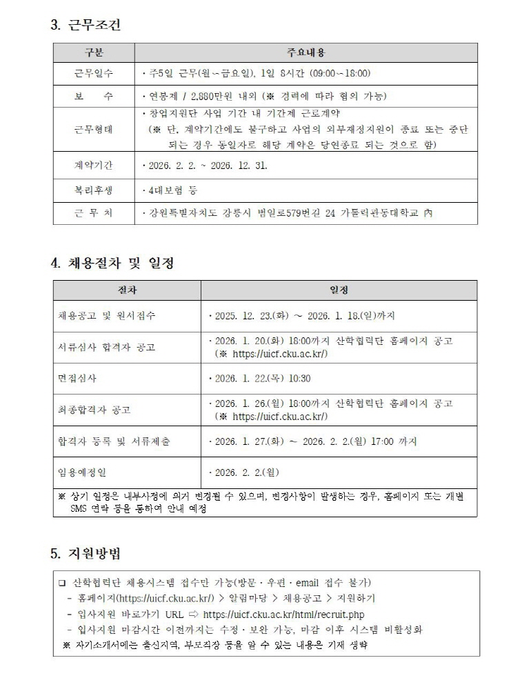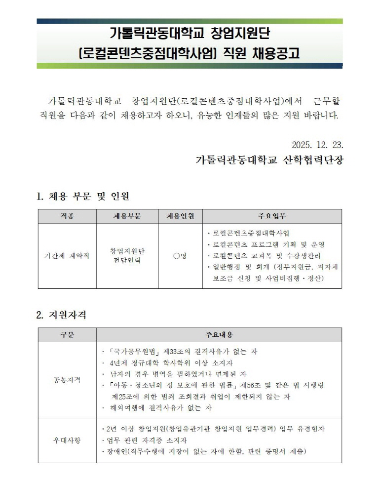 가톨릭관동대학교 창업지원단 (로컬콘텐츠중점대학사업) 직원 채용공고(2026.2.2자 임용예