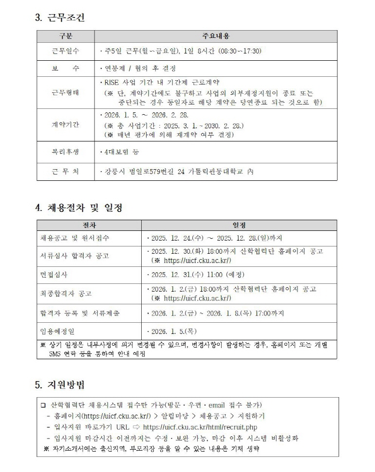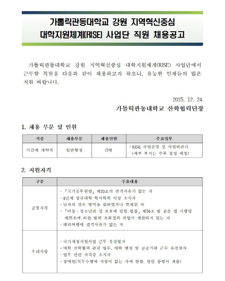 가톨릭관동대학교 강원 지역혁신중심 대학지원체계(RISE) 사업단 직원 채용공고(2026.1