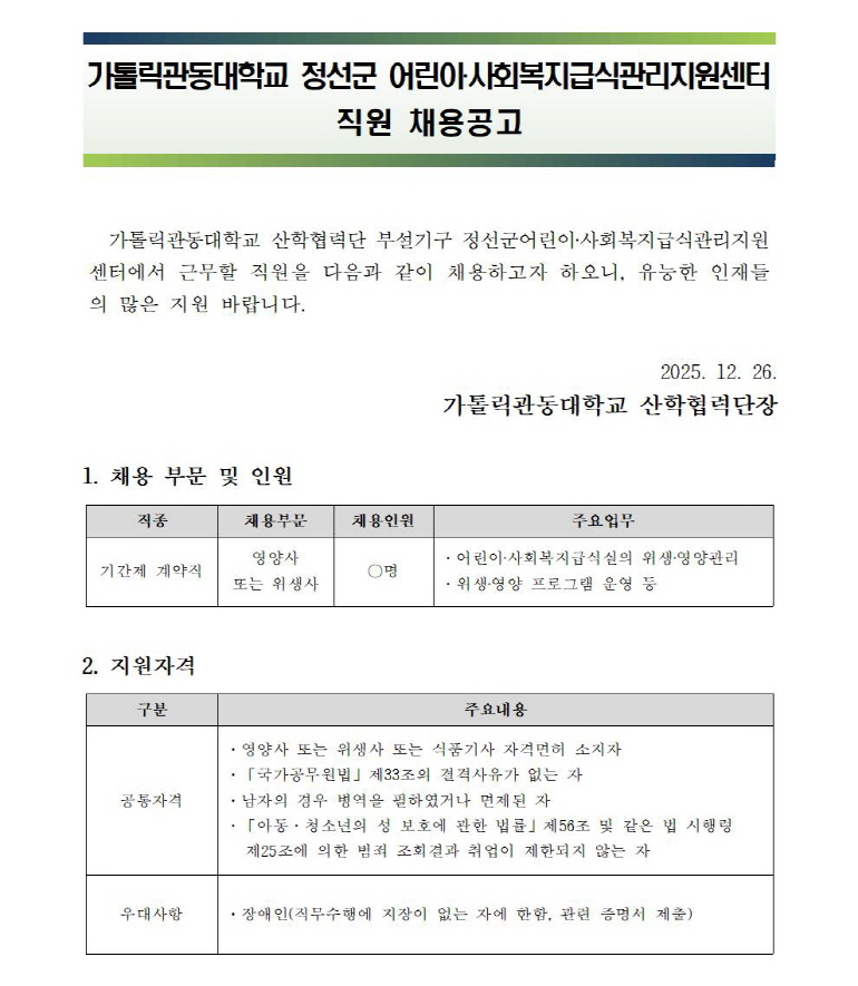 가톨릭관동대학교 정선군어린이·사회복지급식관리지원센터 직원 채용공고(2026.2.1.임용예정