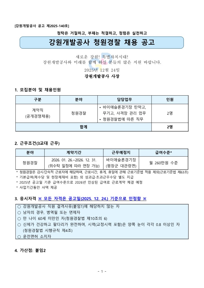 강원개발공사 청원경찰 채용공고 (~1/9)