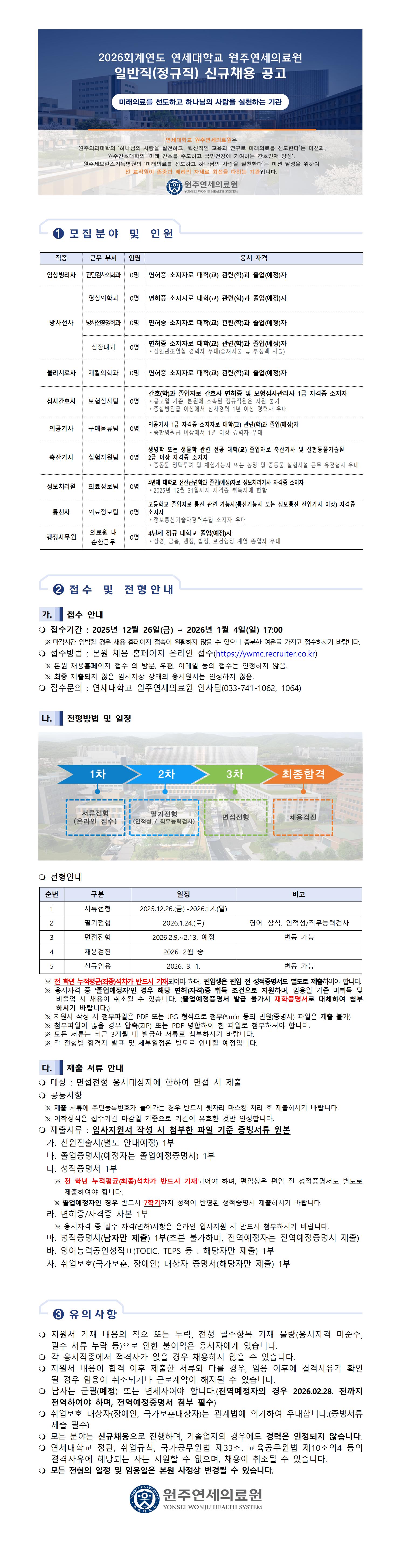 [연세대학교 원주연세의료원] 2026년 일반직(정규직) 채용 공고 (~1/4)