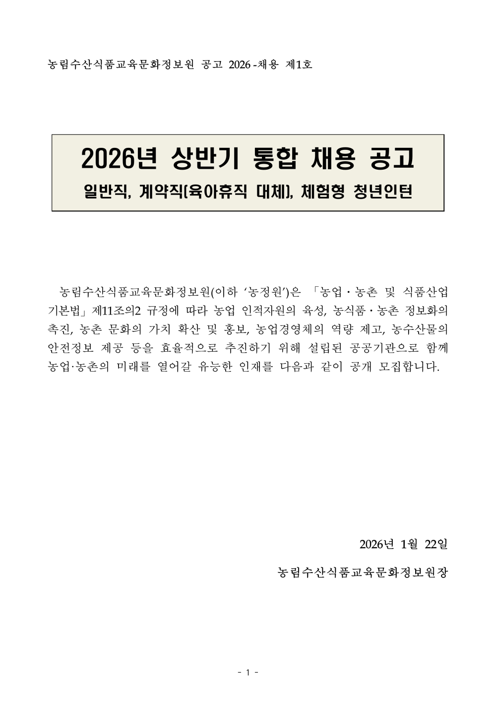 농정원 2026년 상반기 통합 채용 채용 안내