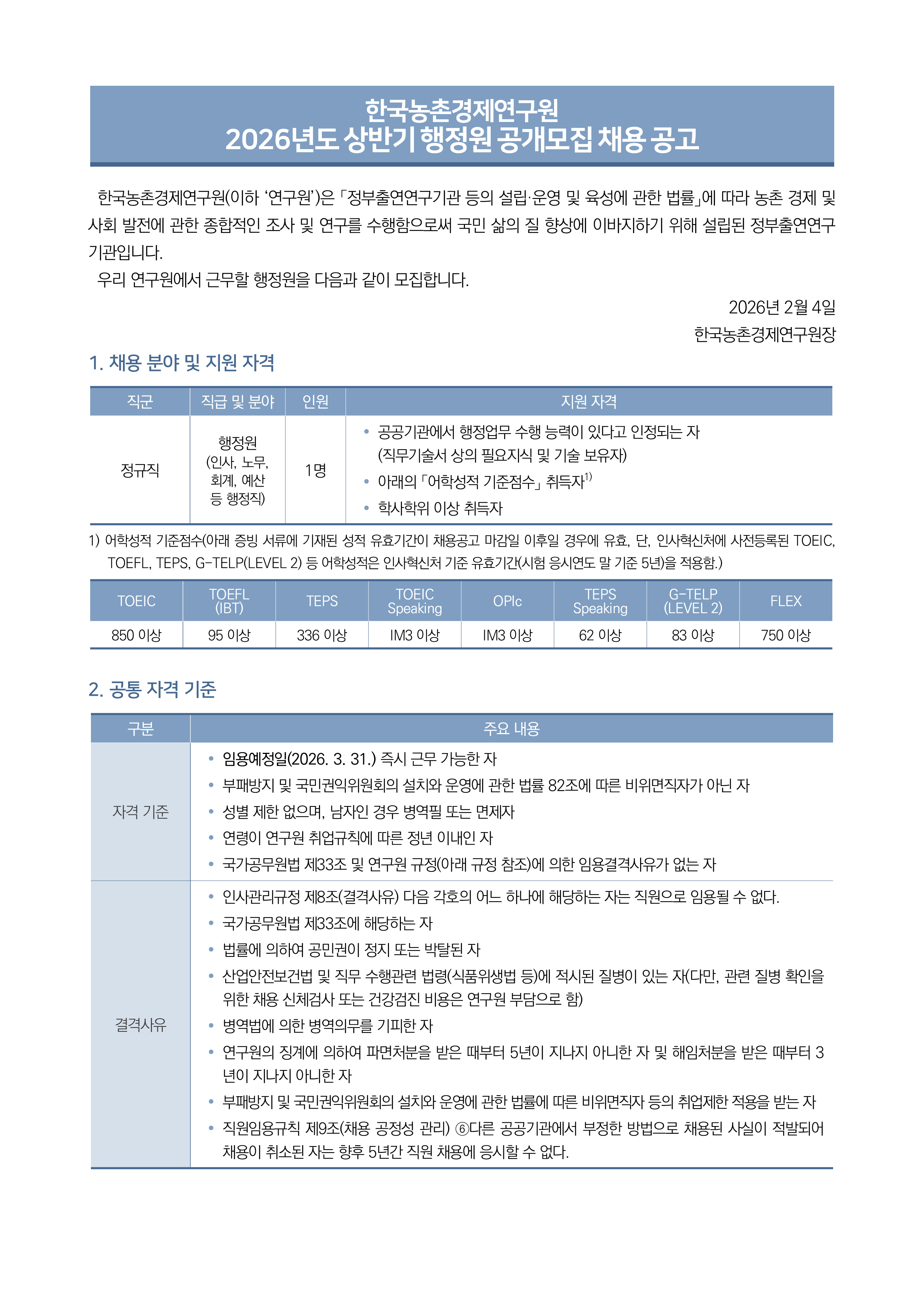 [한국농촌경제연구원] 2026년도 상반기 행정원 공개모집 채용공고