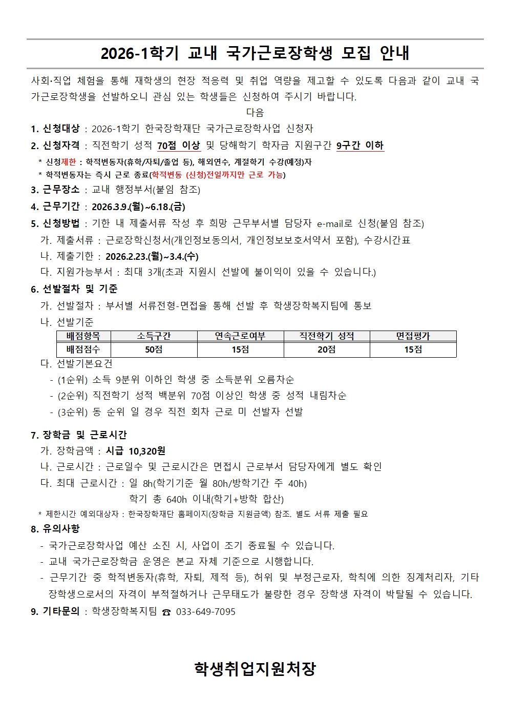 2026학년도 1학기 교외 국가근로 모집 안내(근로복지공단 강릉지사-4명)