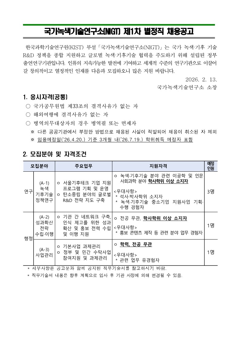 국가녹색기술연구소(NIGT) 제1차 별정직 채용공고 (~3/2)