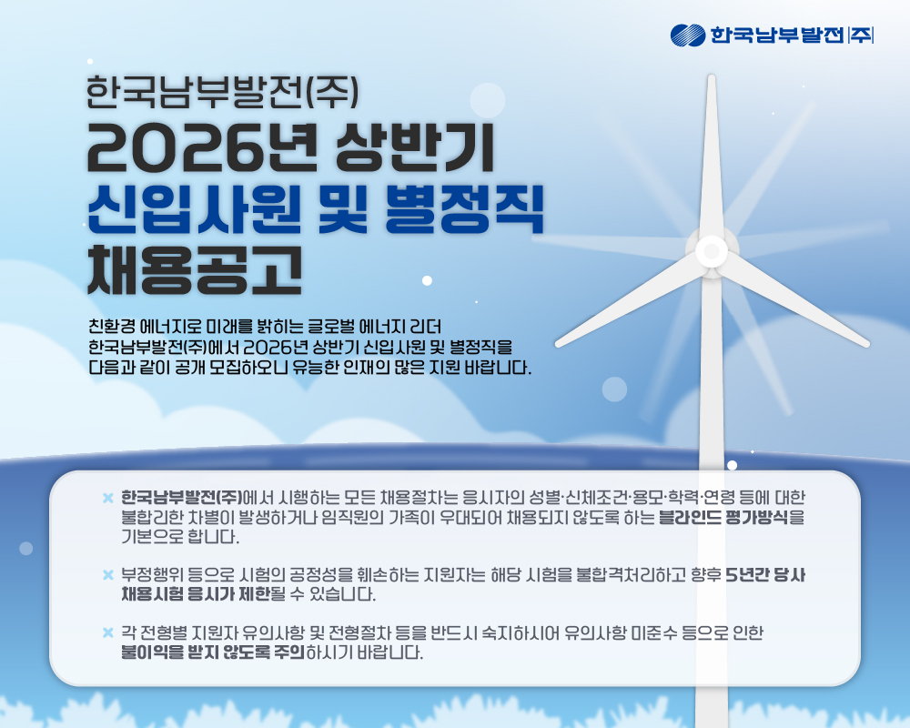 [한국남부발전] 2026년도 상반기 신입사원 및 별정직 채용공고