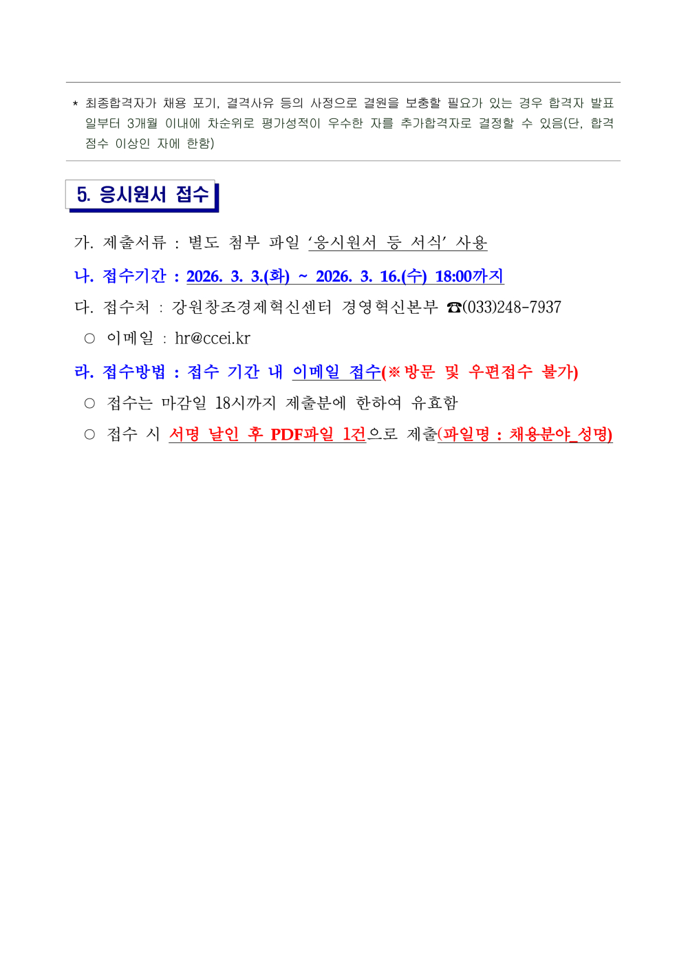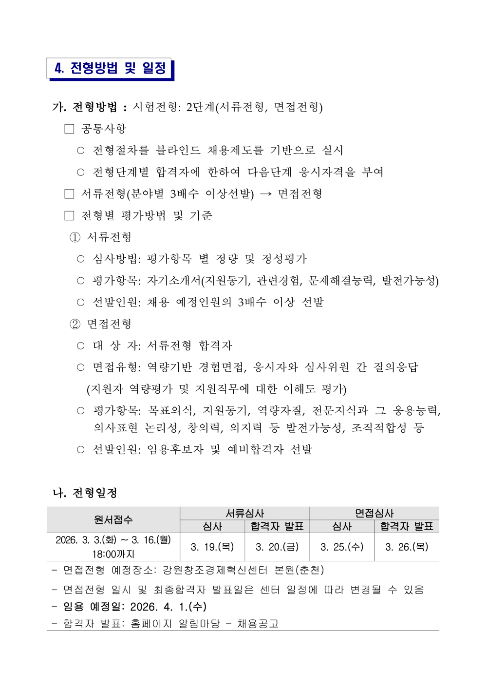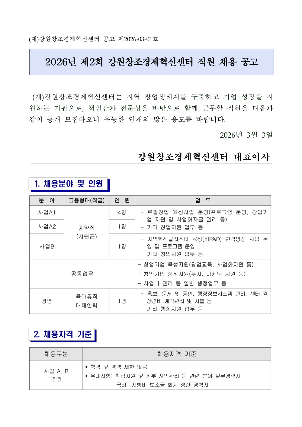 [(재)강원창조경제혁신센터] 2026년 제2회 직원 채용(계약직) 공고