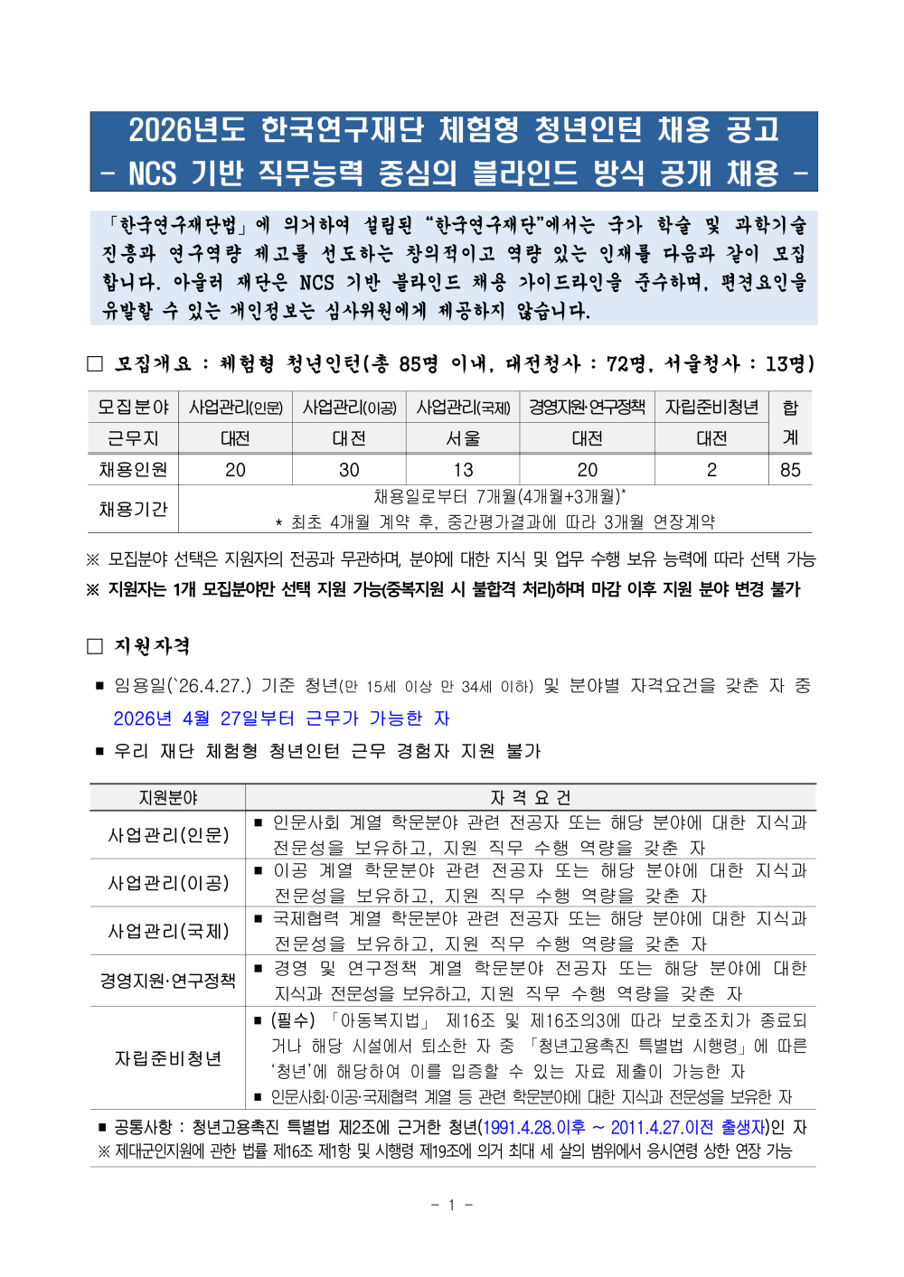 [한국연구재단] 2026년도 체험형 청년인턴 채용 공고