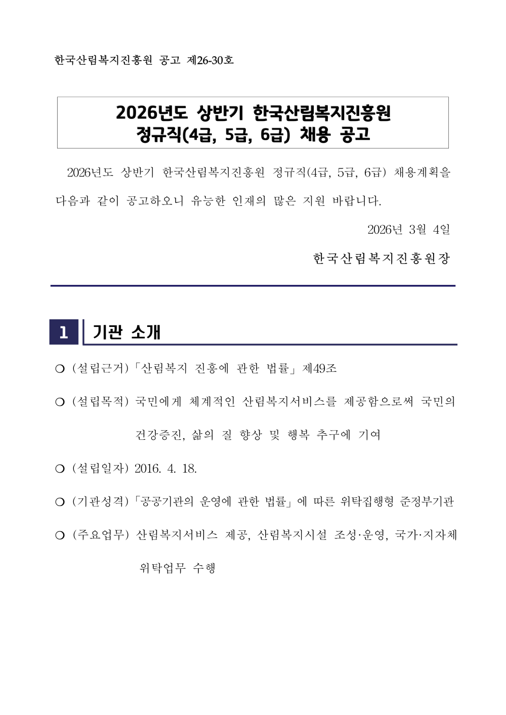 [한국산림복지진흥원] 2026년도 상반기 정규직(4급, 5급, 6급) 채용 공고(~3/20