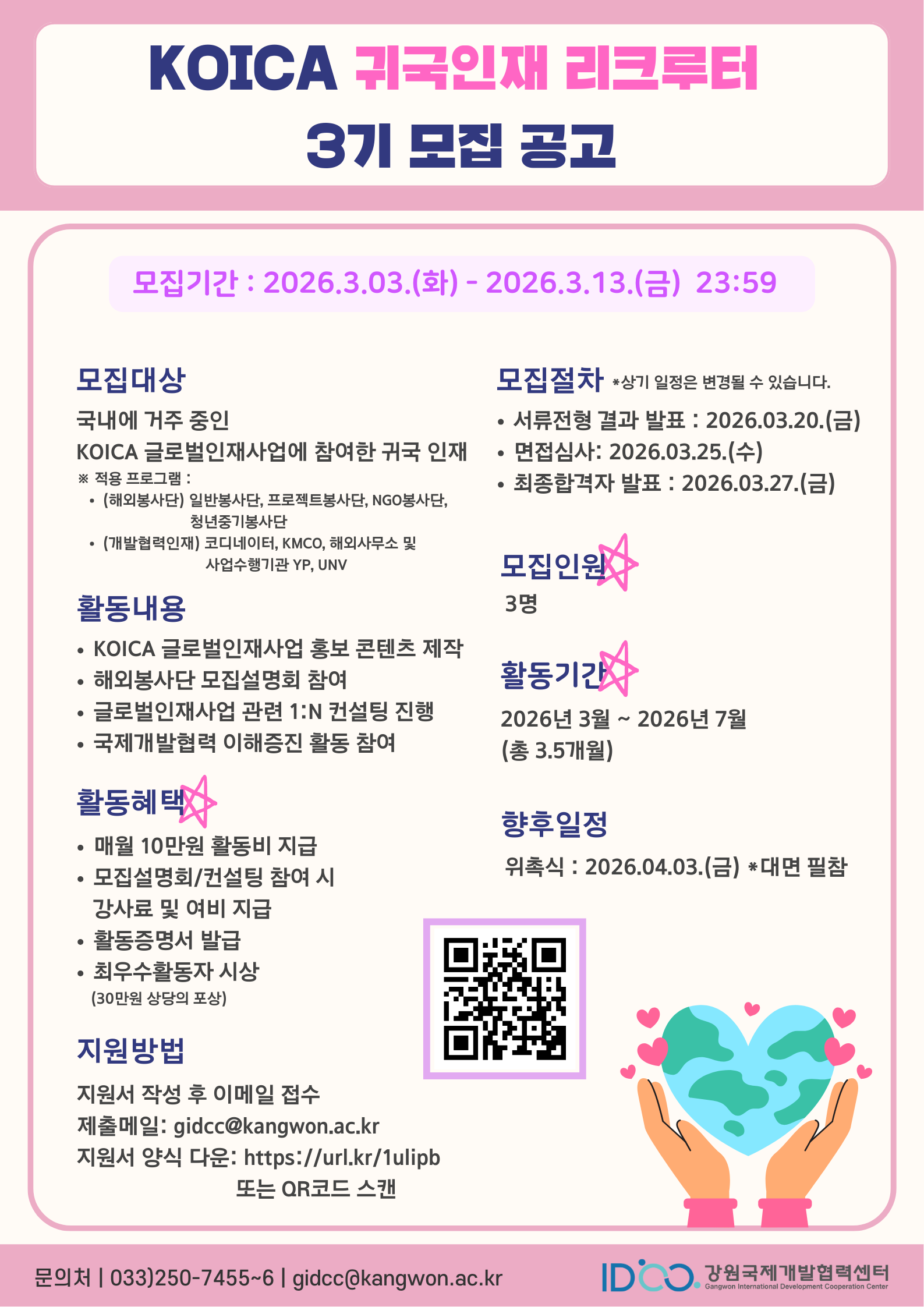 강원국제개발협력센터에서 <KOICA 귀국인재 리크루터 3기>를 모집합니다. 국제개발협력에 관심 있고, 실제 글로벌인재사업에 참여한 경험이 있으신 귀국인재 분들의 많은 관심과 적극적인 지원 바랍니다.