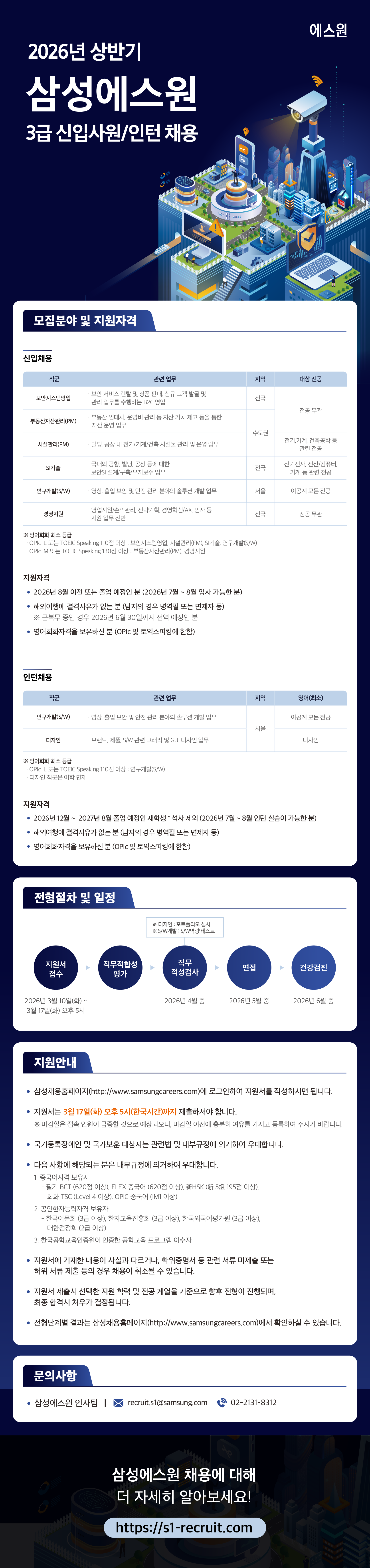 - 신입: 보안시스템영업, 부동산자산관리(PM), 시설관리(FM), SI기술, 연구개발(S/W), 경영지원