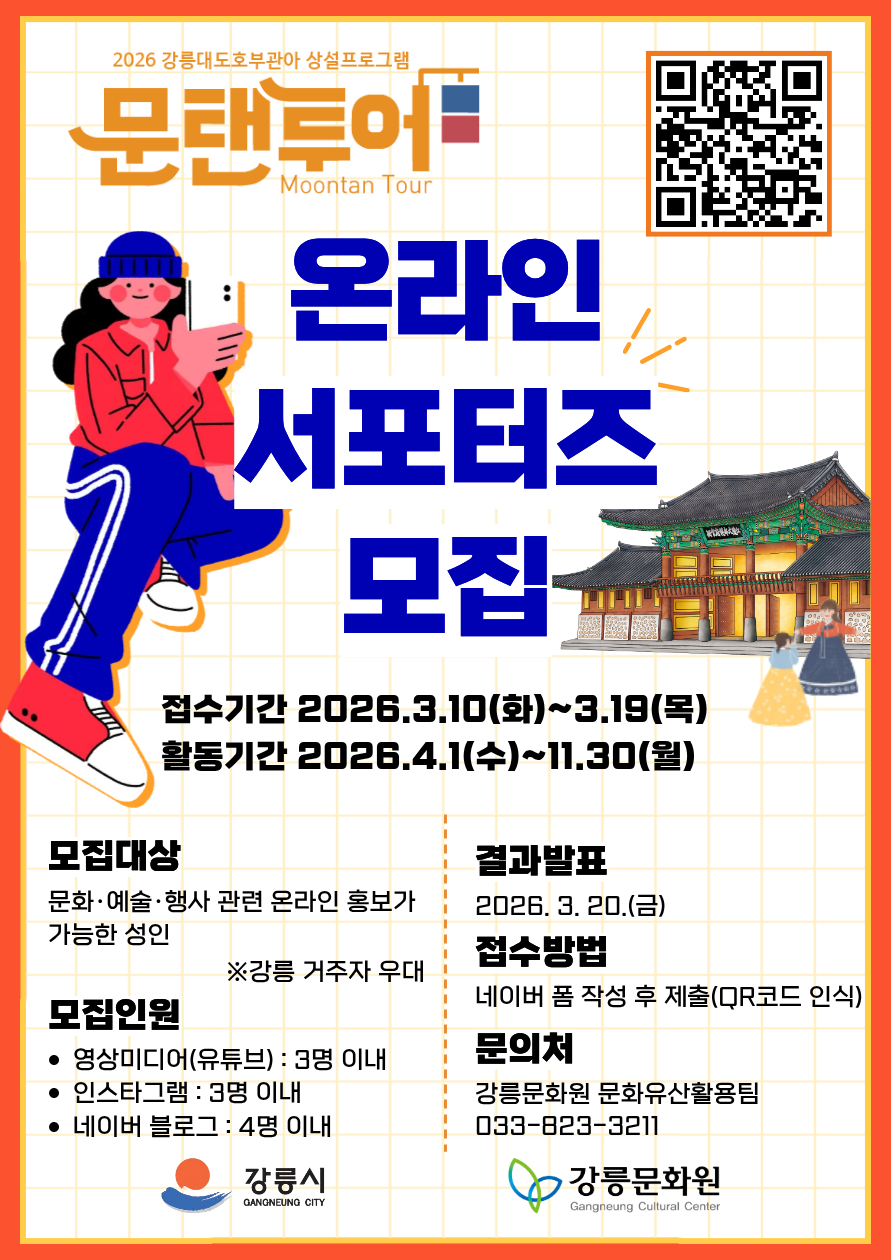 15204 [강릉문화원] 2026 강릉대도호부관아 상설프로그램 문탠투어 온라인 서포터즈 모집 새글 대기 취업지원팀 2026.03.13 17 2