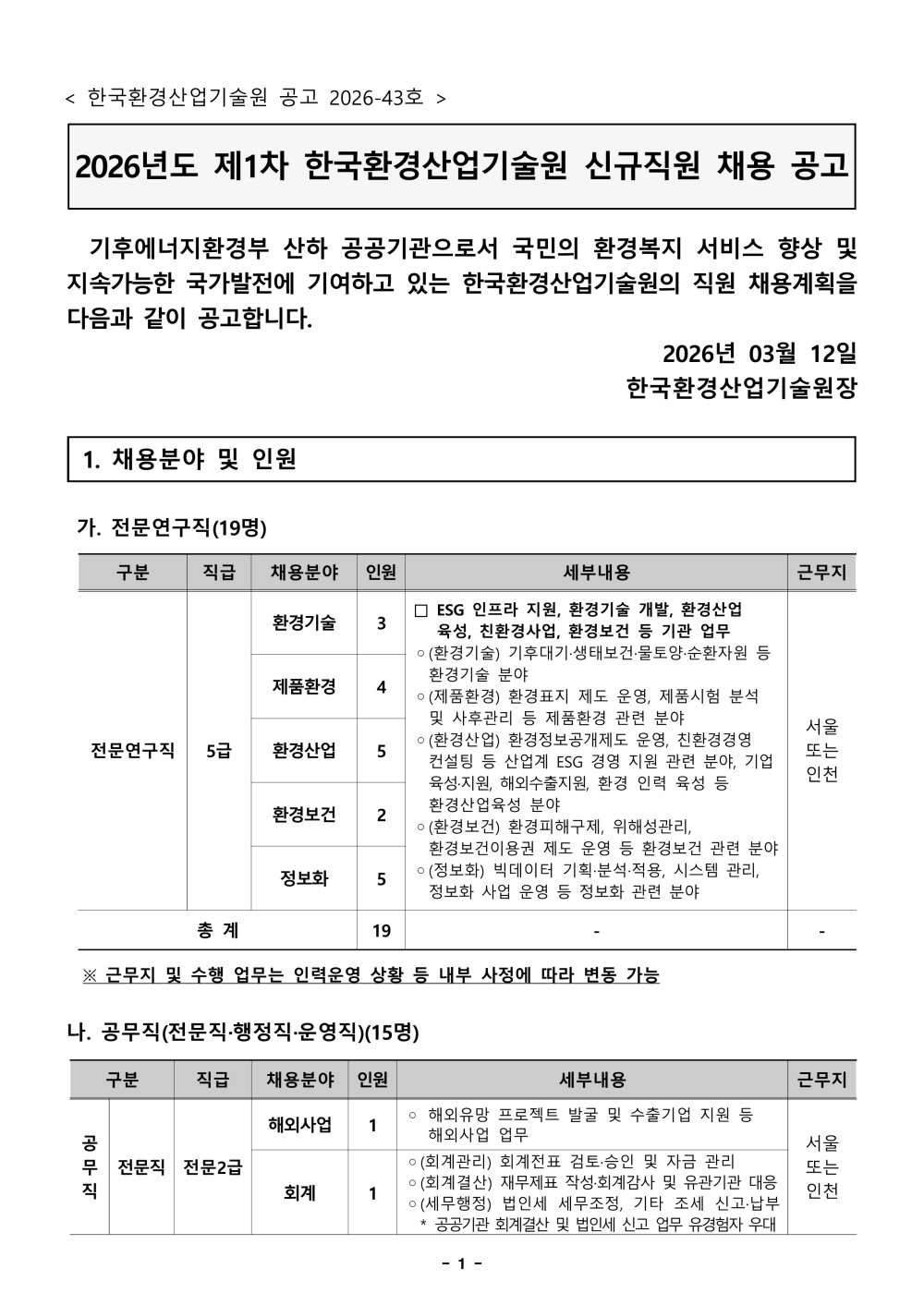 [한국환경산업기술원] 2026년도 제1차 신규직원 채용공고