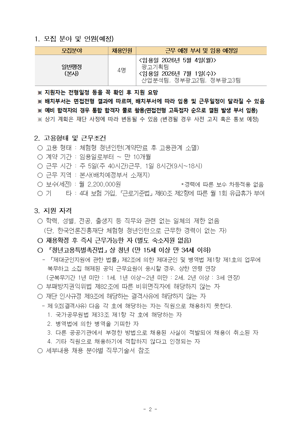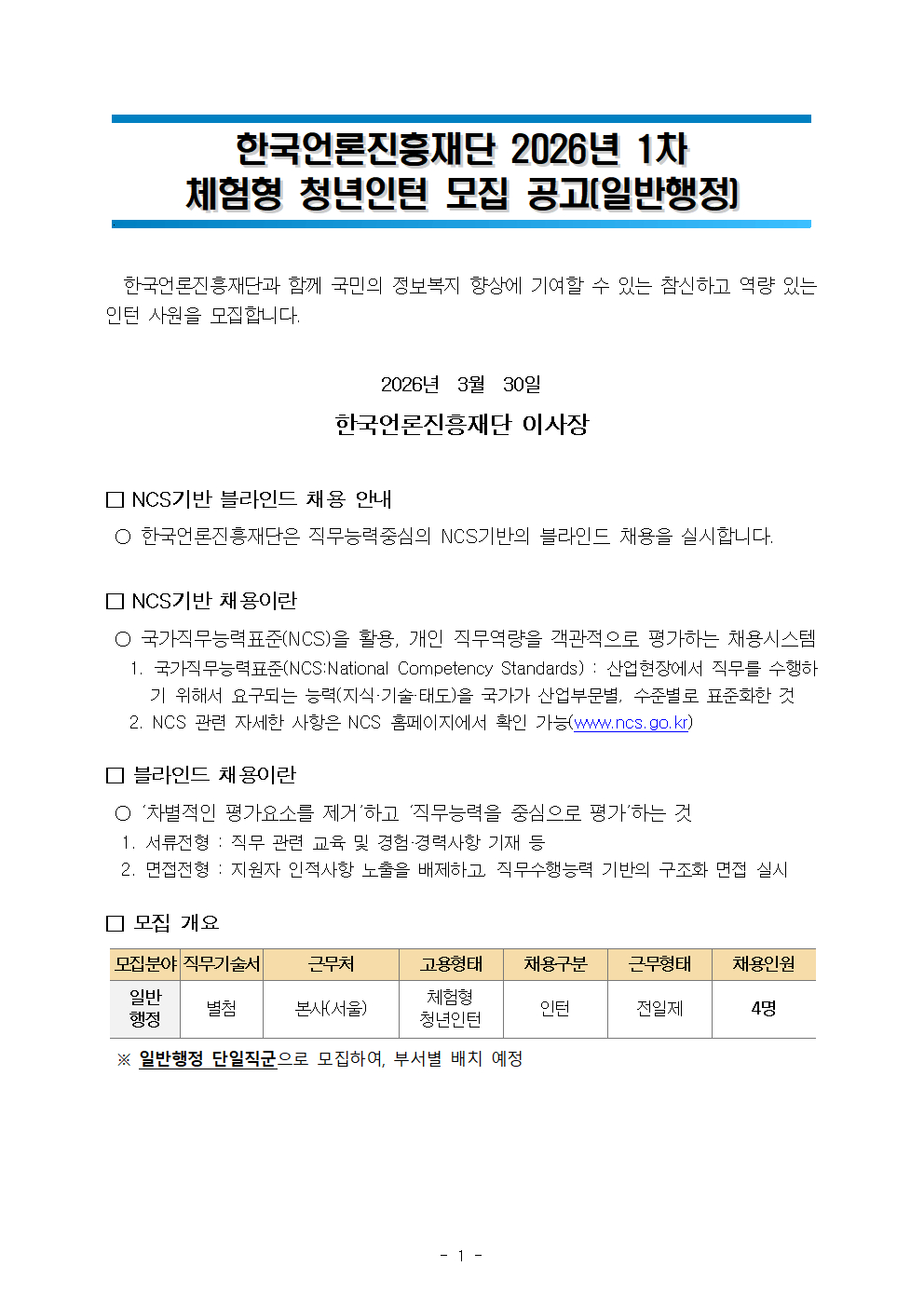 [한국언론진흥재단] 2026년 1차 체험형 청년인턴 모집 공고(~4/13)