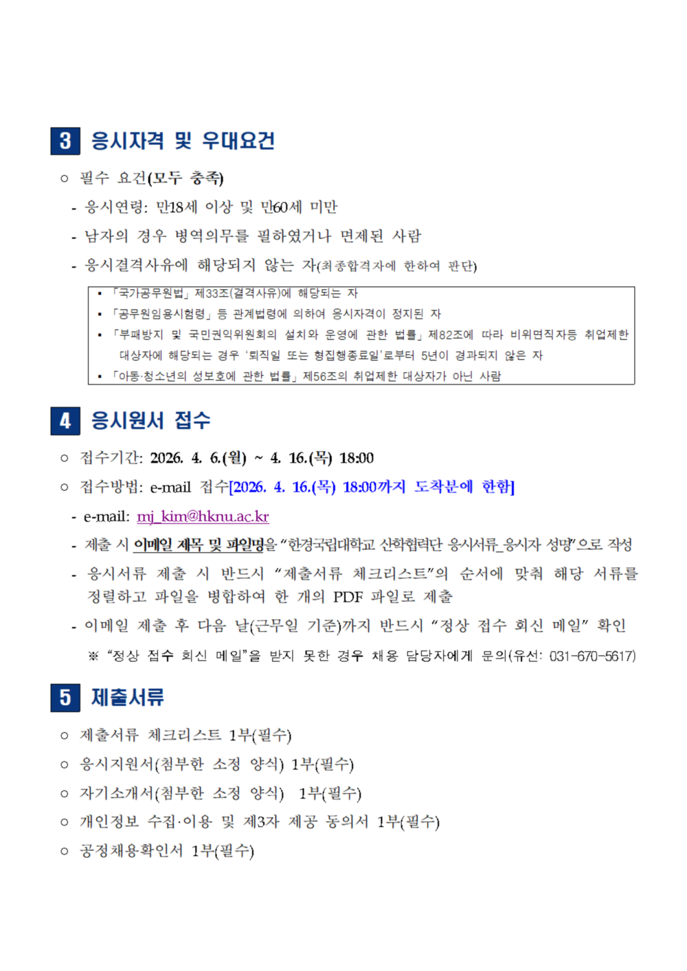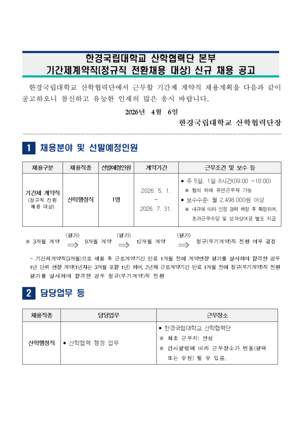 [한경국립대학교] 산학협력단 본부 기간제계약직(정규직 전환채용 대상) 신규 채용 공고