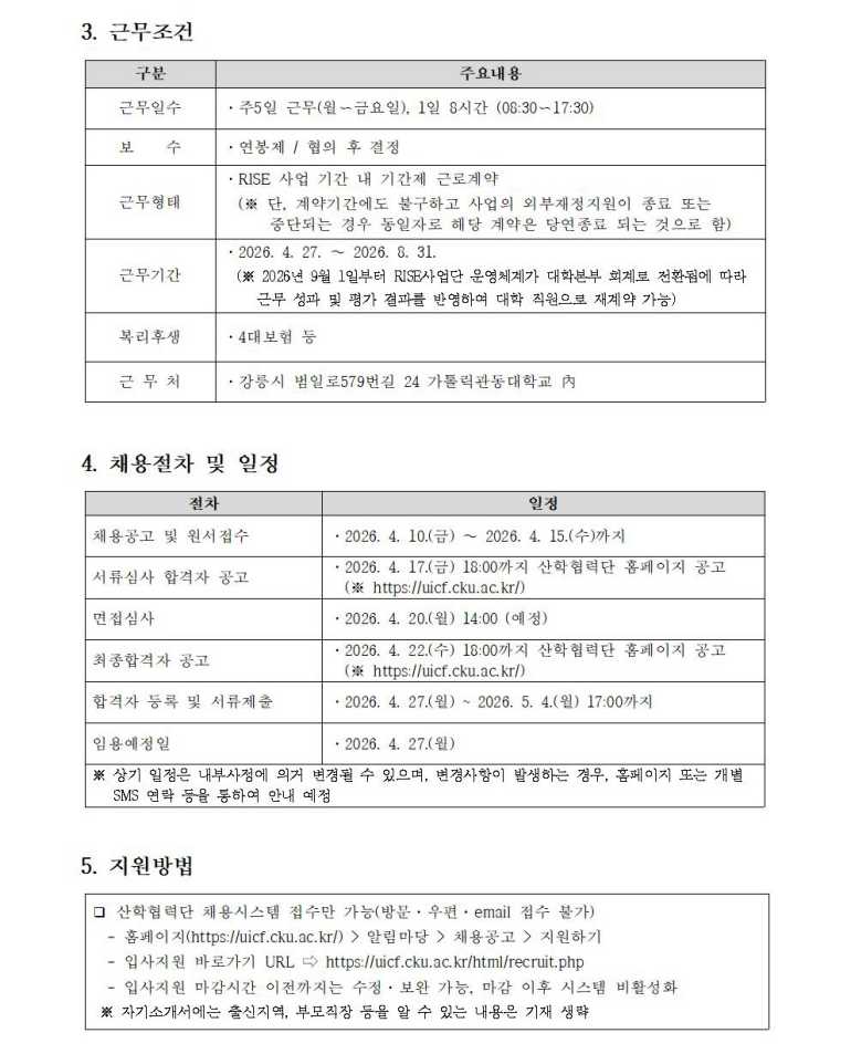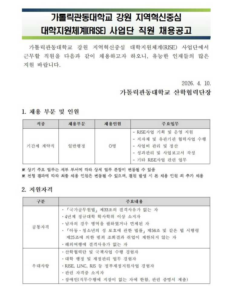 가톨릭관동대학교 강원 지역혁신중심 대학지원체계(RISE) 사업단 직원 채용공고(2026.0
