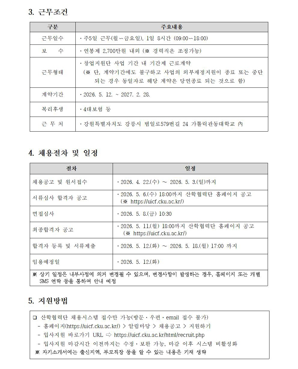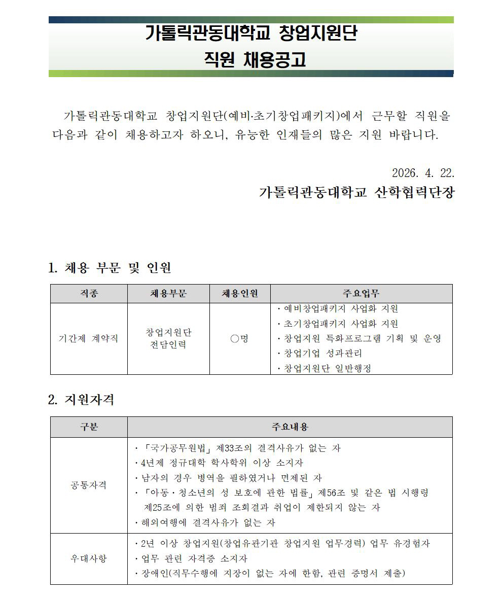 가톨릭관동대학교 창업지원단 직원 채용공고(2026.5.12.자 임용예정)