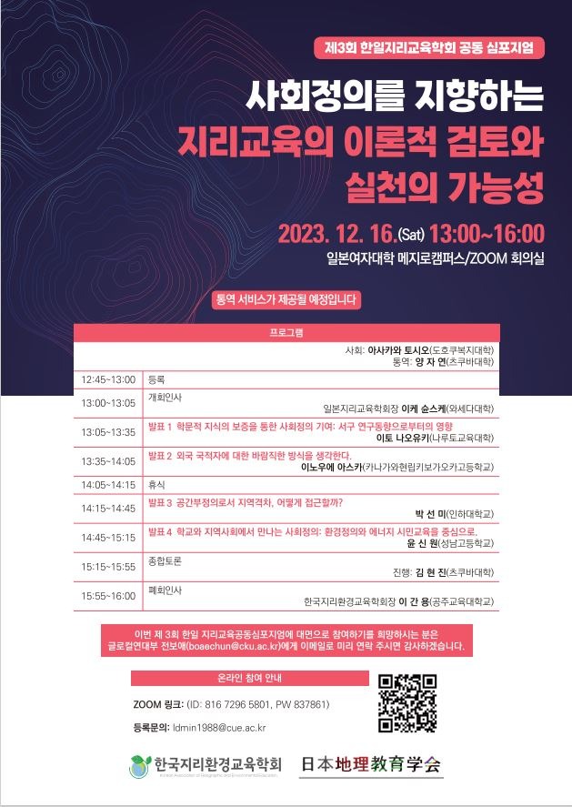 12월 16일(토) ~17(일) 한일 양국의 지리교육을 대표하는 두 학회(한국지리환경교육학회, 일본지리교육학회)가 ‘사회정의를 지향하는 지리교육의 이론적 검토와 실천의 가능성’을 주제로 도쿄 소재 일본여자대학교 메지로 캠퍼스에서 온 오프라인 연계로 공동 심포지엄을 개최했습니다.