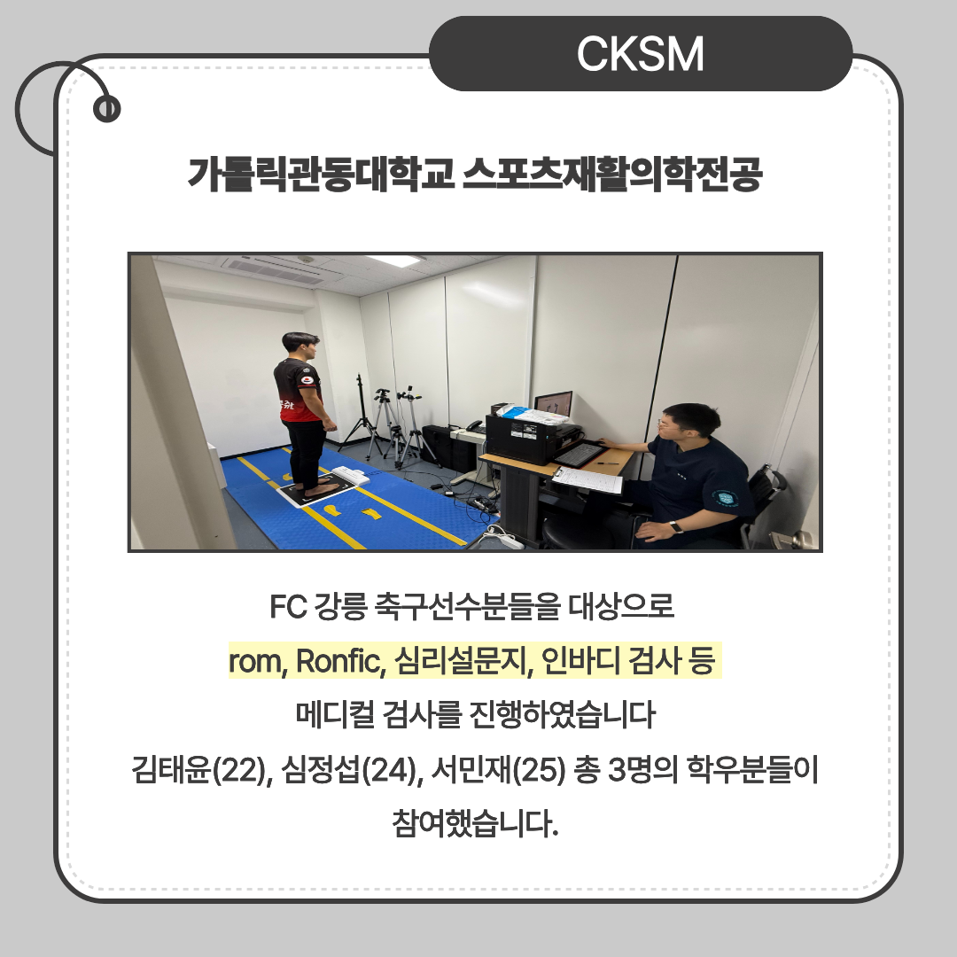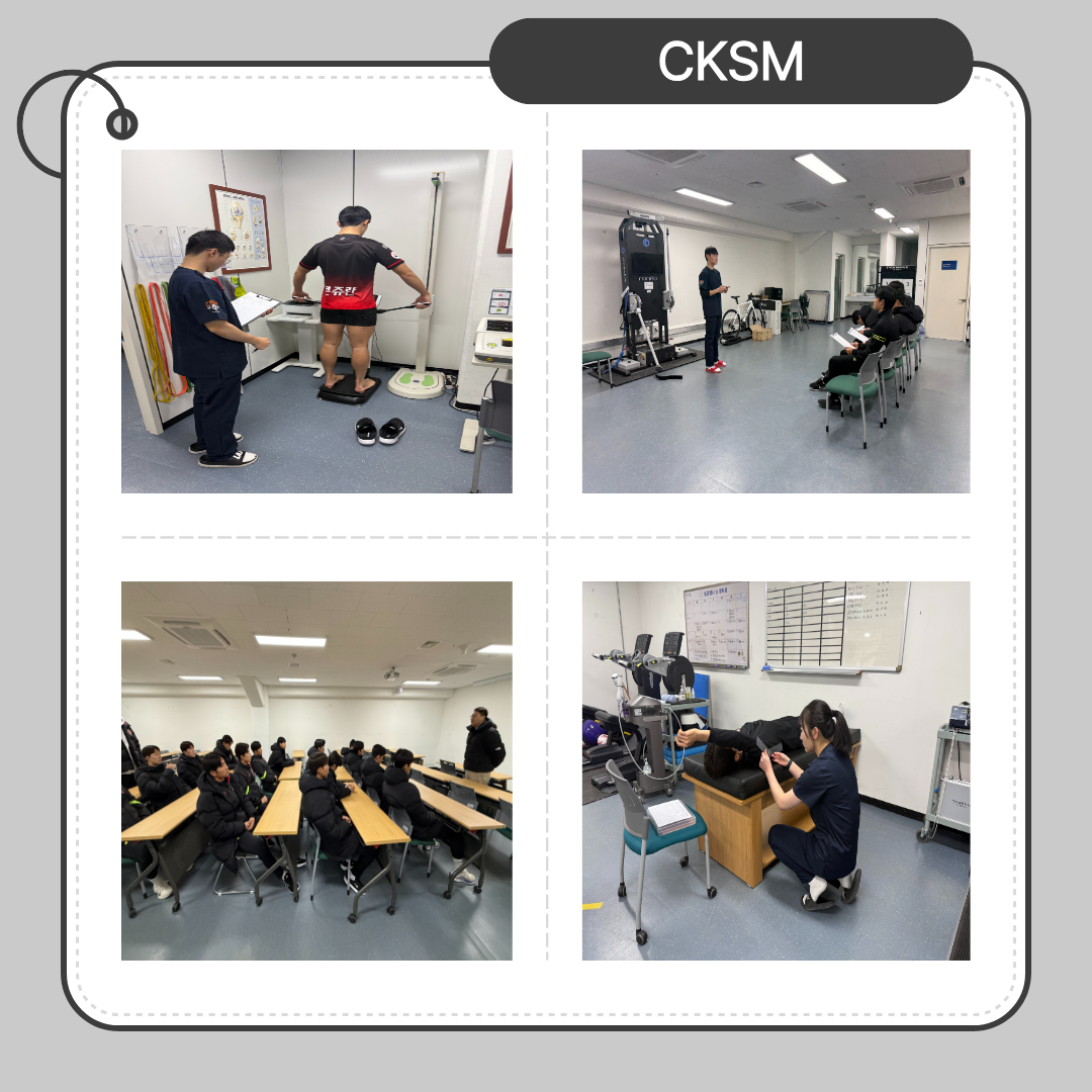 가톨릭관동대학교 스포츠재활의학전공 CKSM은 학우분들을 위해 축구부, 야구부, 럭비구단, 아이스하키 등 다양한 팀의 메디컬 측정 및 실습 기회를 제공하고 있습니다.