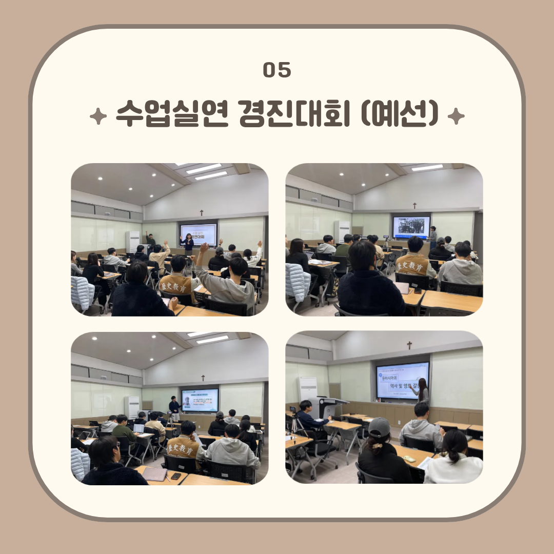 11월 10일 전공강의실(509)에서 수업실연 경진대회 예선이 진행되었습니다. 역사교육과 내 총 3팀이 참여하였고,
