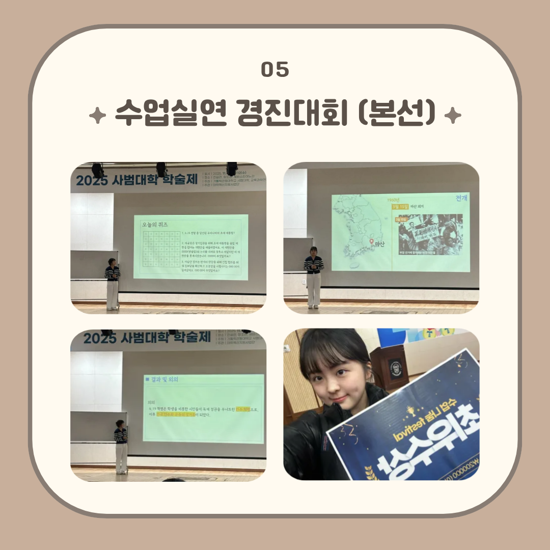 11월 12일 창조관 지하 대강당에서 수업실연 경진대회 본선이 진행되었습니다. 역사교육과 대표로 출전한 [이*민, 김*서] 팀은 최우수상을 수상하였습니다!