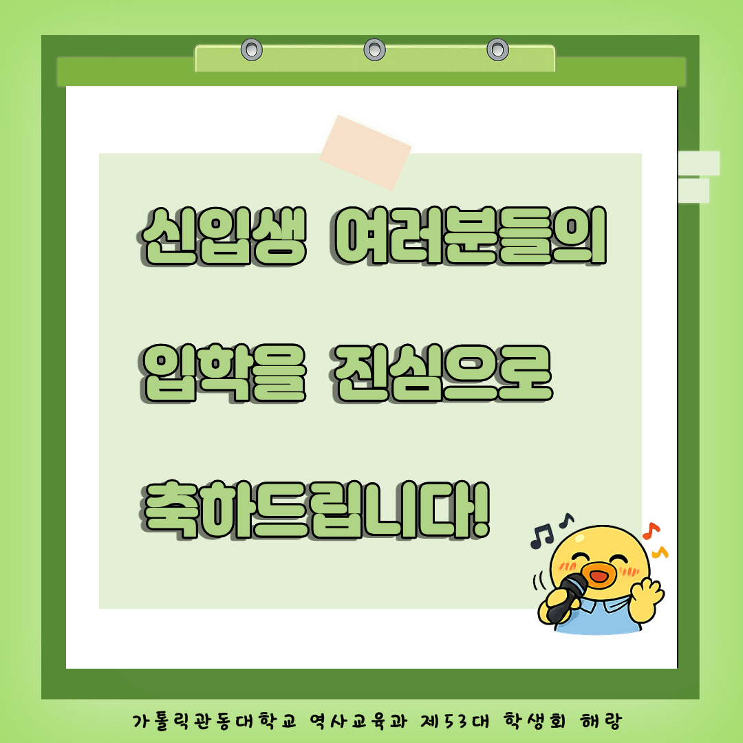 저희 학생회 '해랑'은 신입생 여러분의 역사교육과 입학을 진심으로 축하하며, 앞으로도 다양한 행사와 소식들을 알려드리며 찾아뵙겠습니다. 감사합니다!