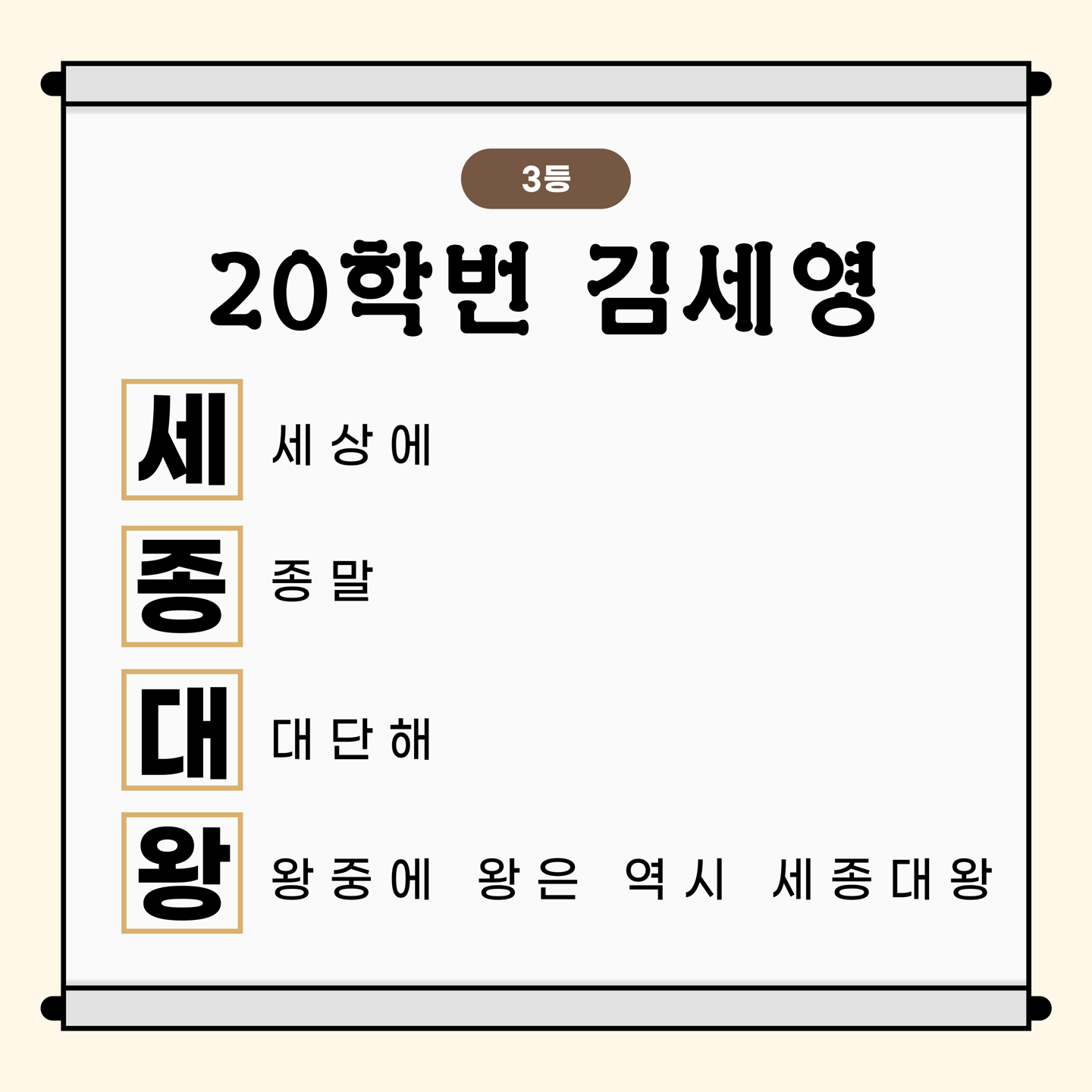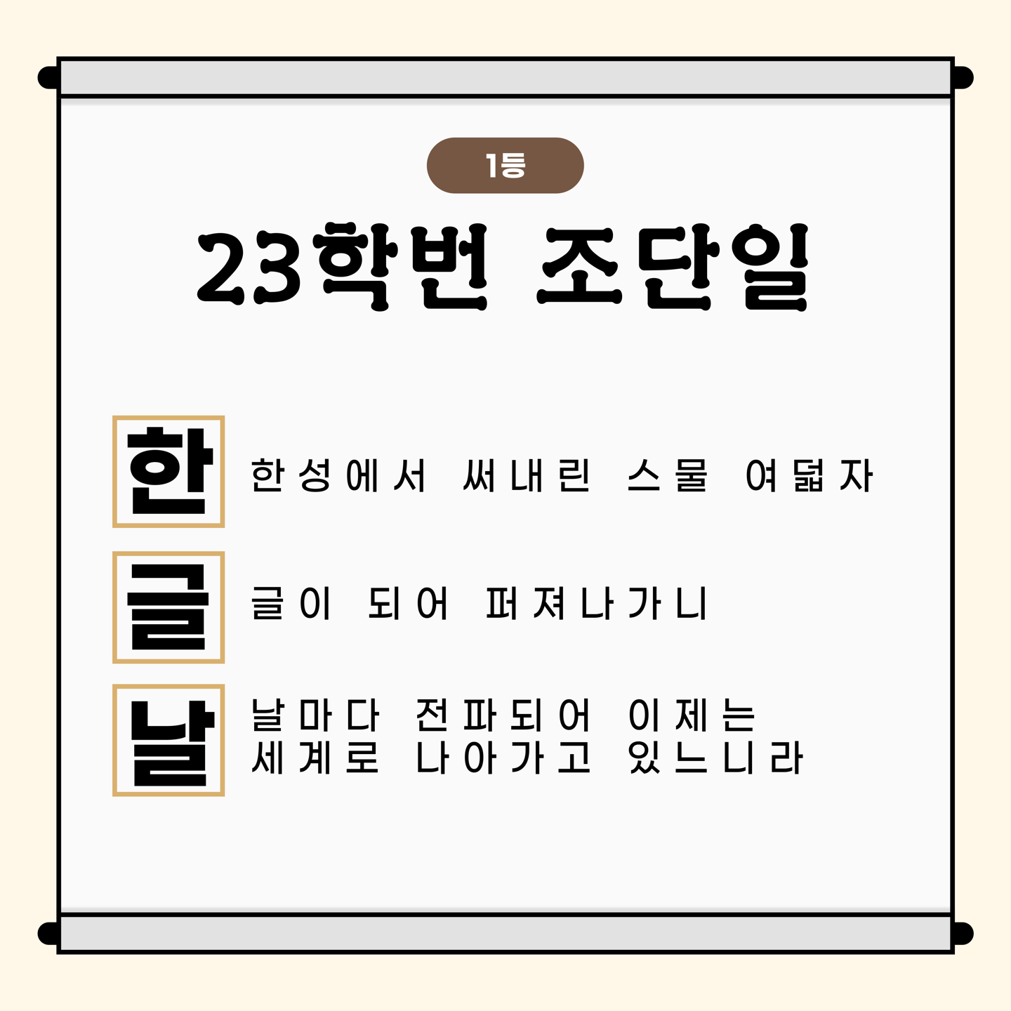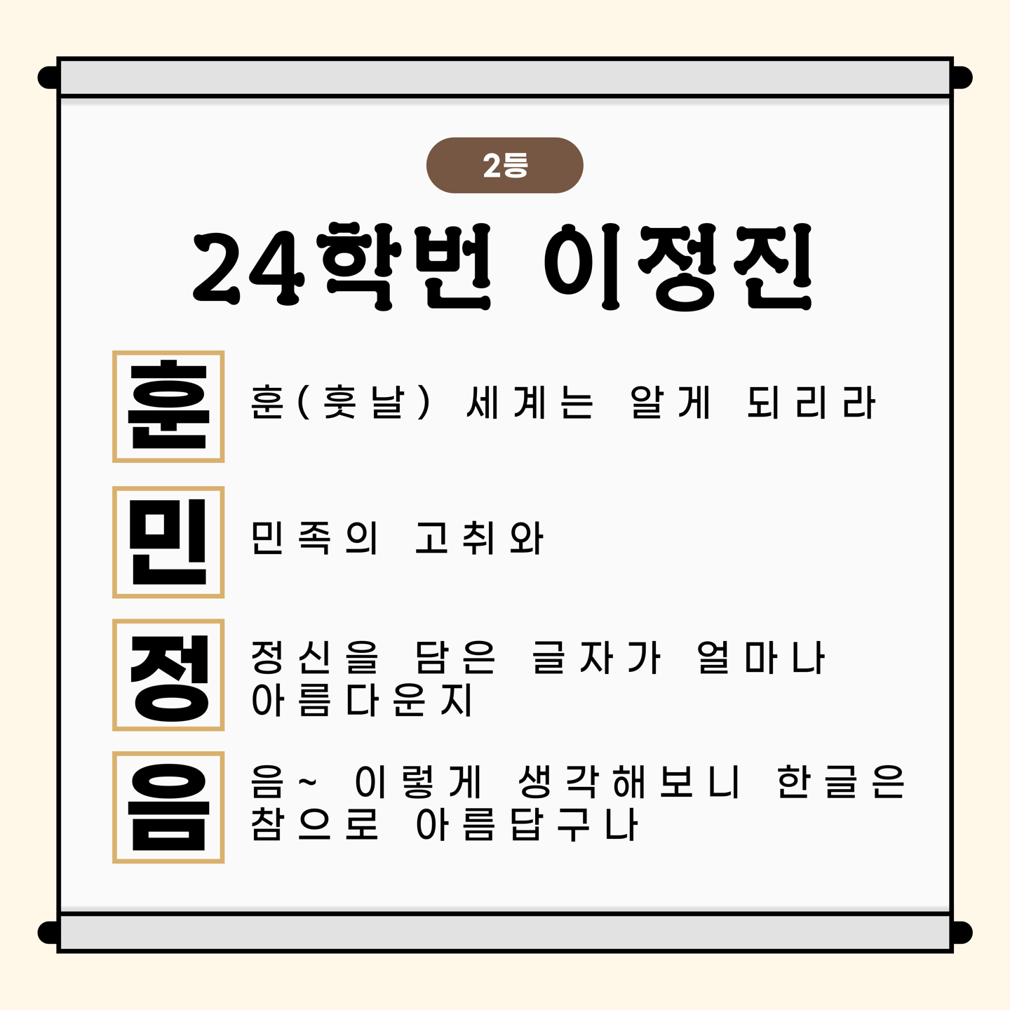 많은 학우분들께서 한글날, 세종대왕, 훈민정음, 집현전을 주제로 수준 높은 N행시를 보내주셨습니다. 그 중 순위권에 든 학우분들의 N행시를 공개합니다!