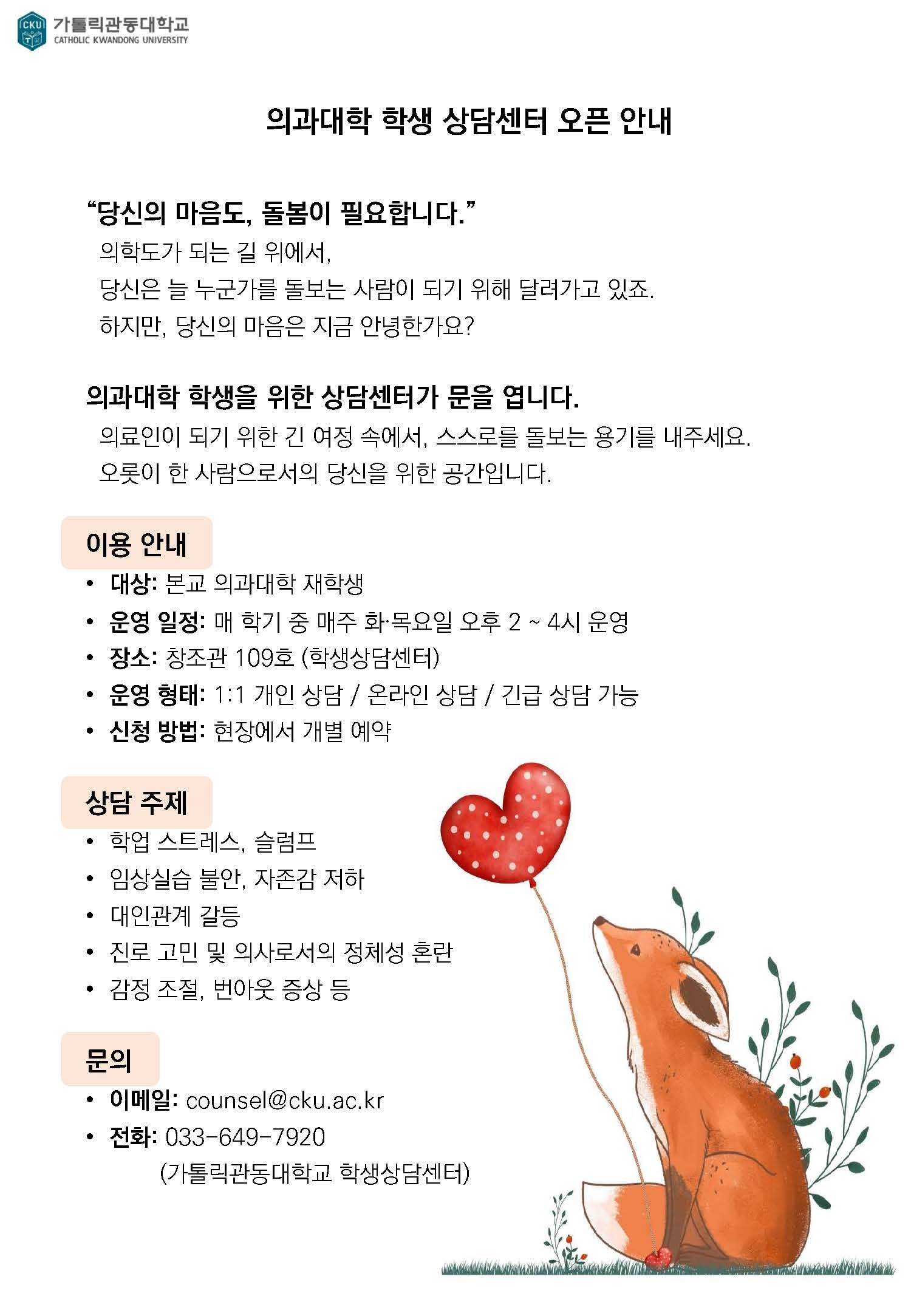 의과대학 학생 상담센터 오픈 안내