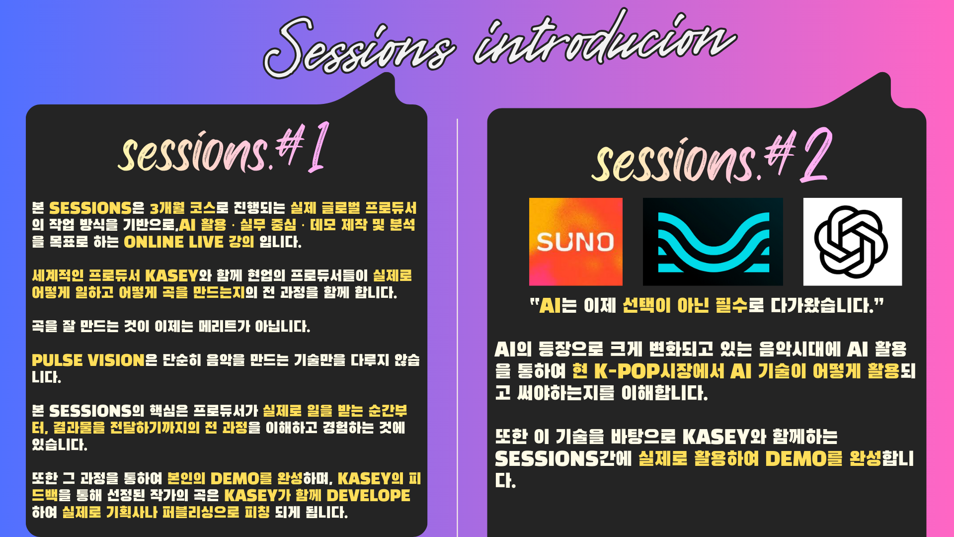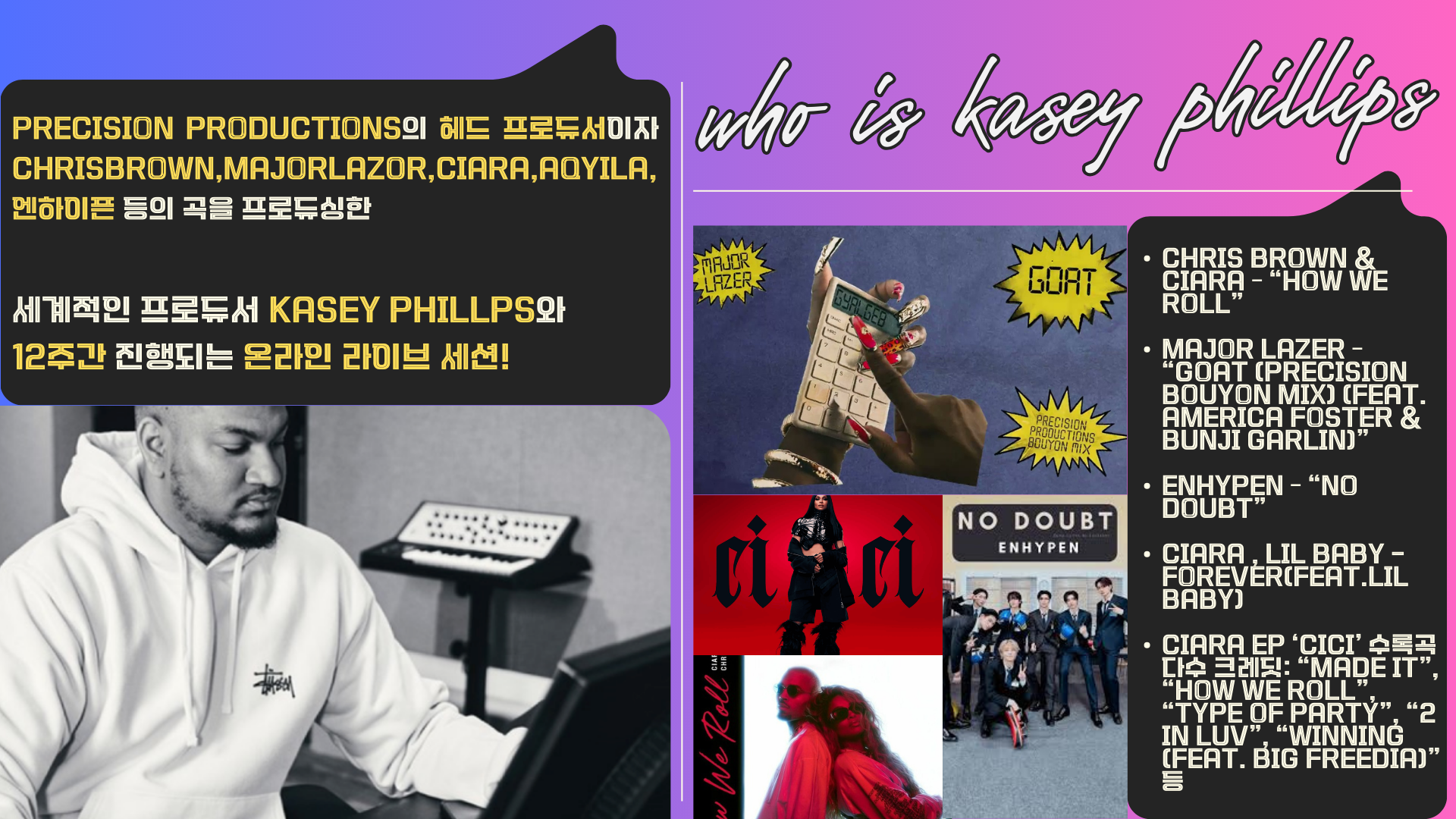 본 프로그램은 K-POP 및 글로벌 음악 시장에서 실제로 활동 중인 세계적인 해외 프로듀서들과 함께하는 실시간 라이브 세션을 통해