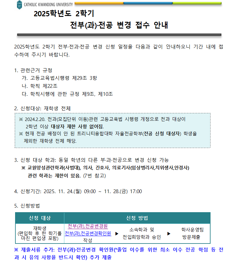 2025학년도 2학기 전부(과)·전공 변경 신청 접수 안내