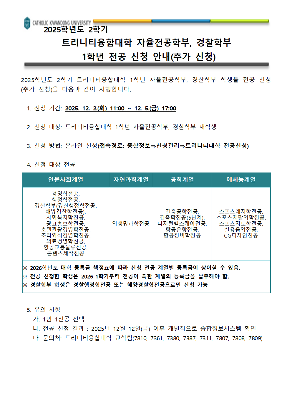 2025학년도 2학기 트리니티융합대학 자율전공학부, 경찰학부 1학년 전공 신청 안내(추가 접수)