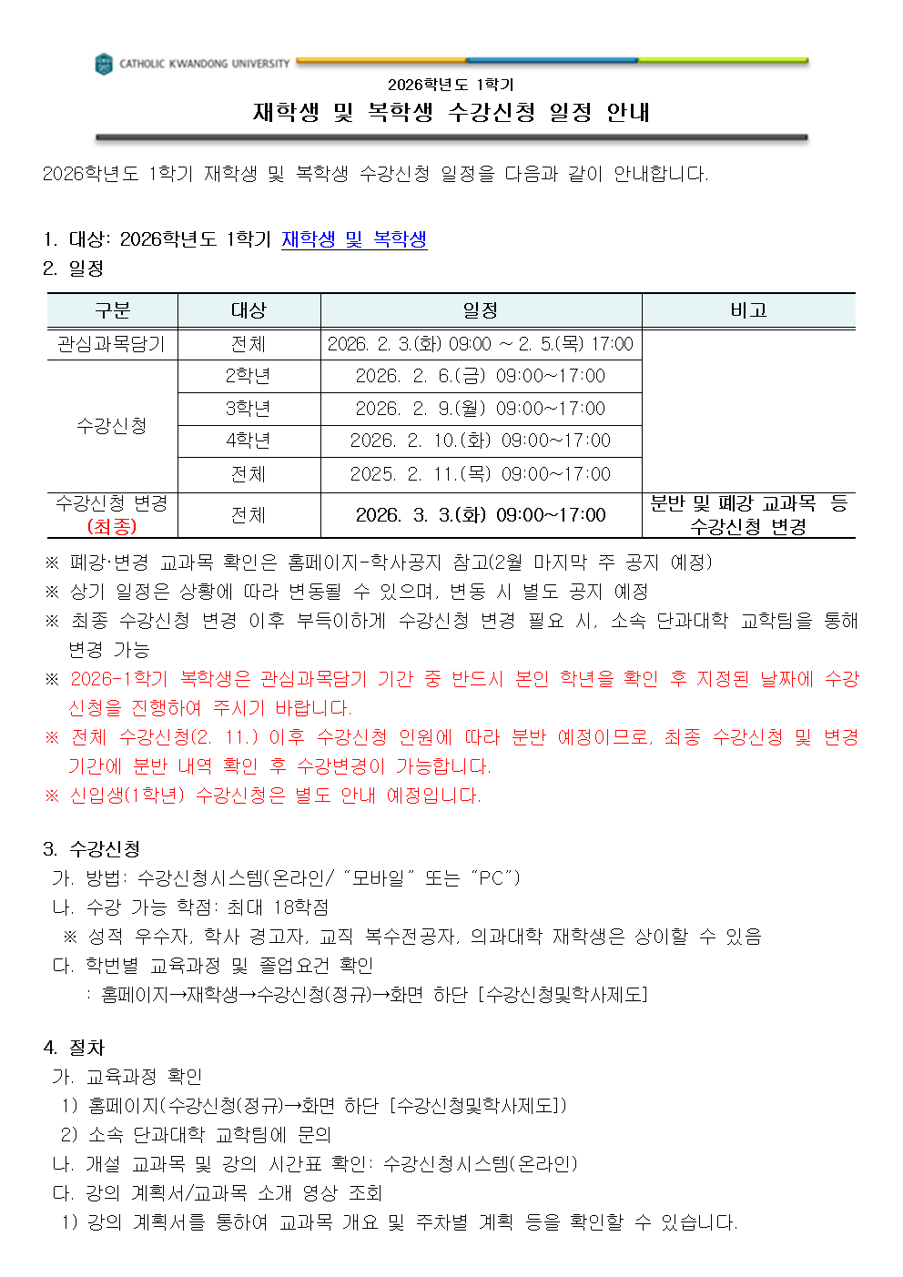 2026-1학기 재학생 및 복학생 수강신청 안내